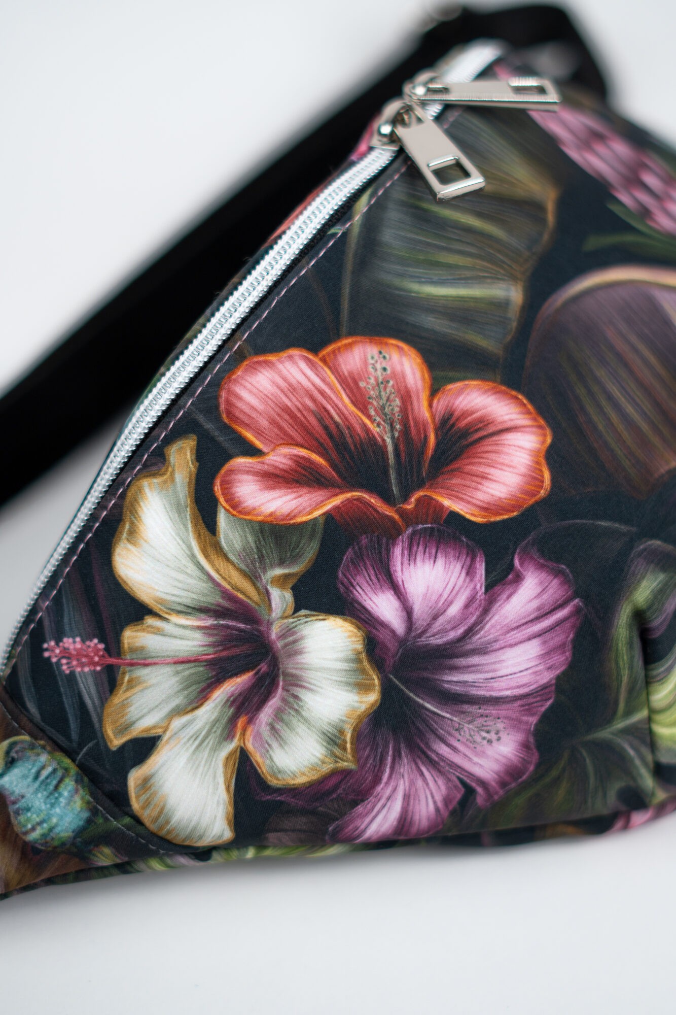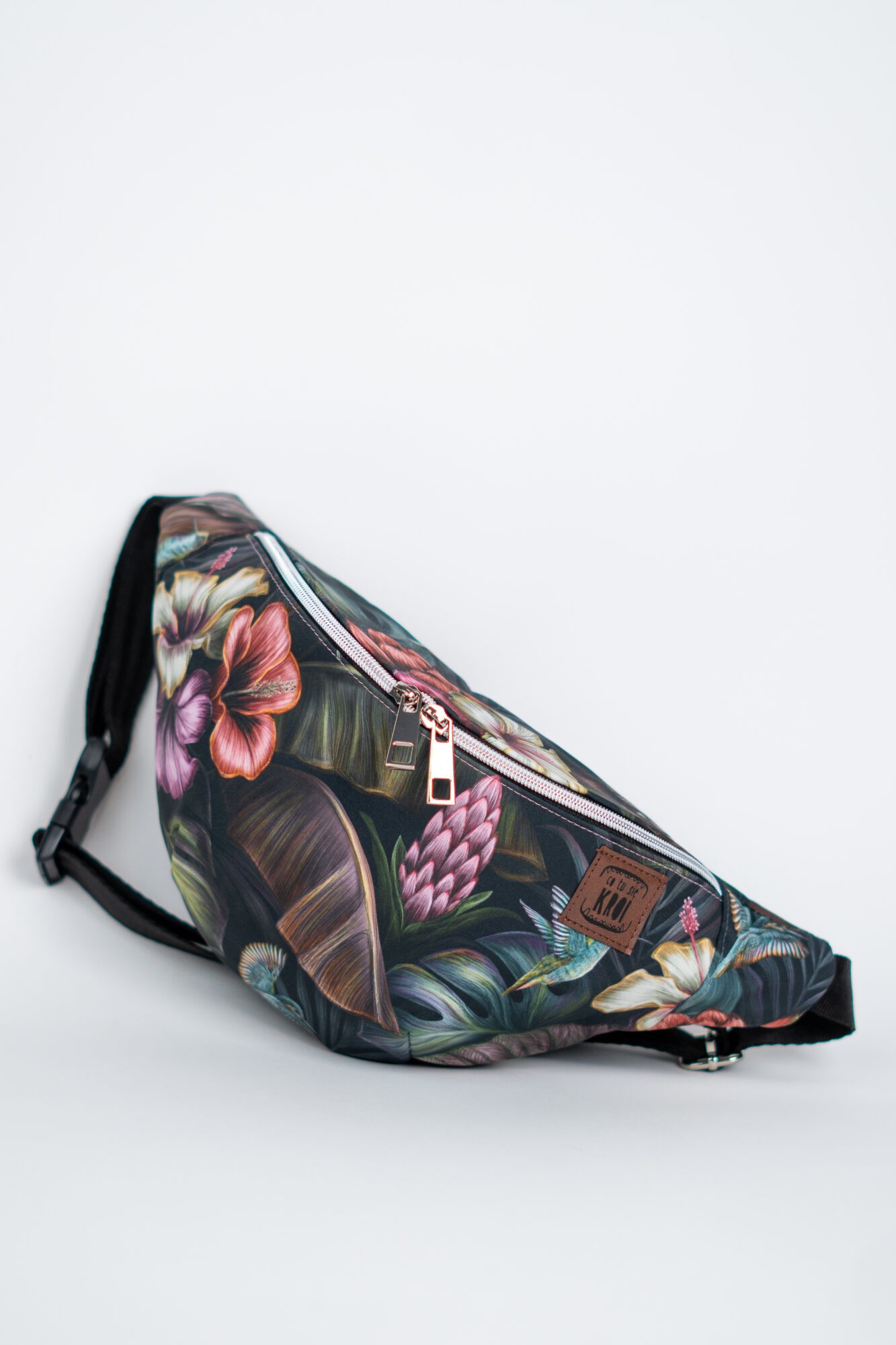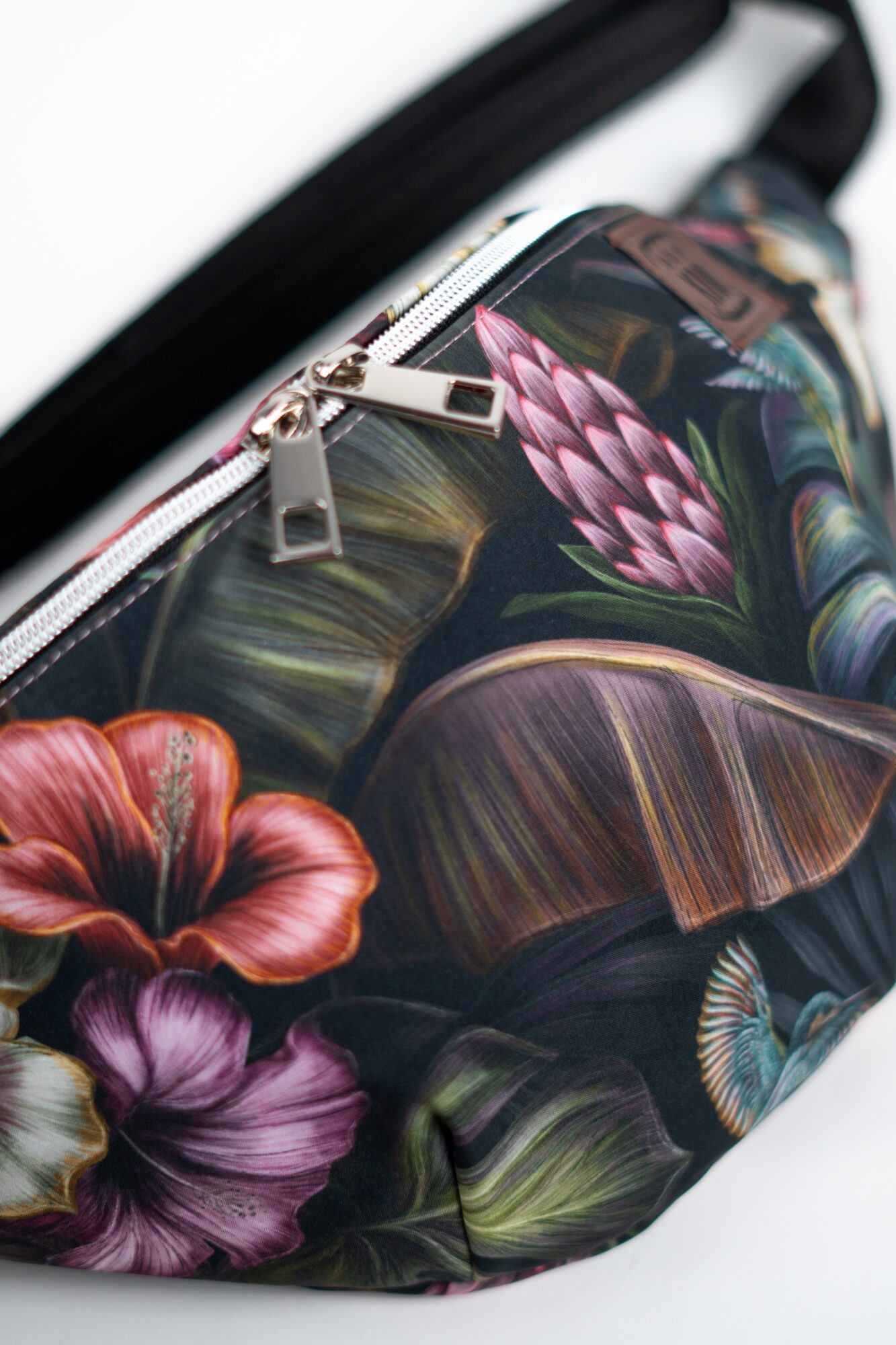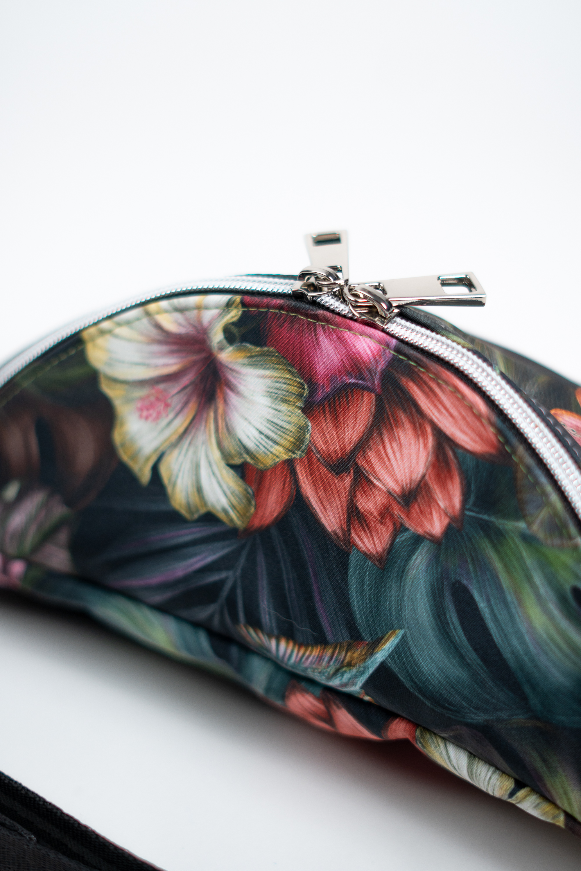Czarna saszetka nieprzemakalna nerka sportowa w kwiaty TAJEMNICE KWIATÓW