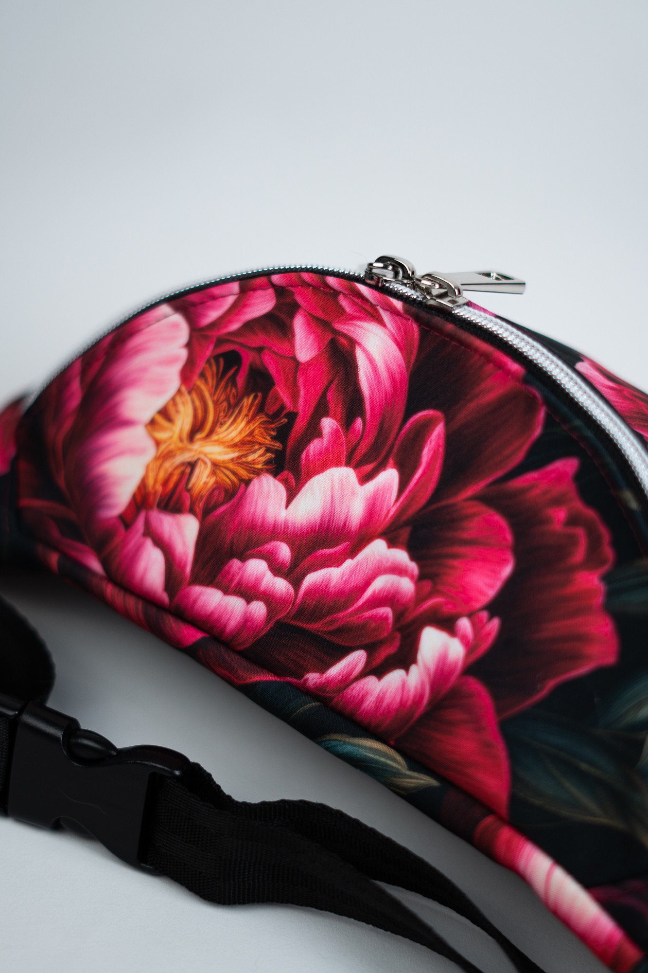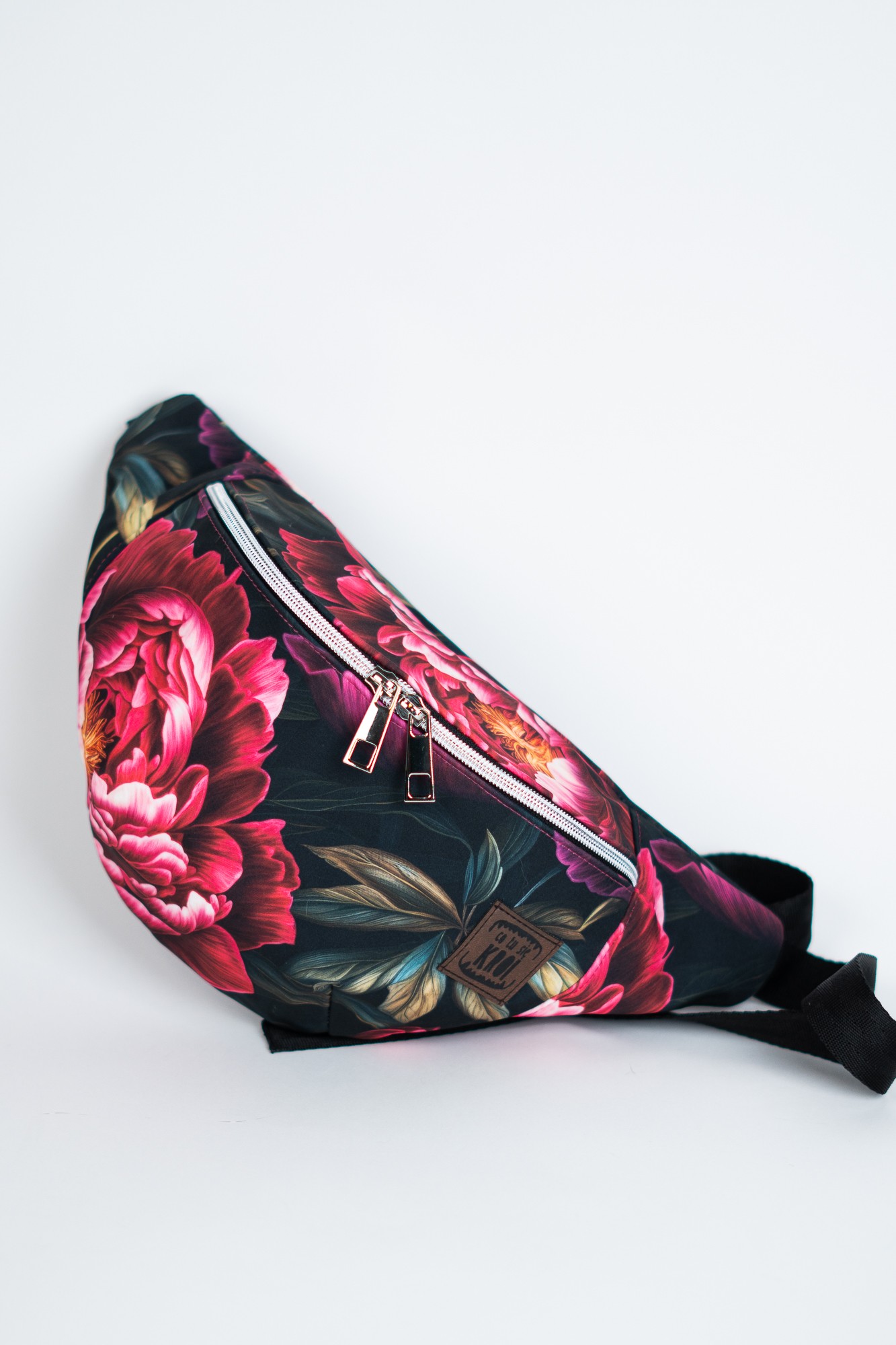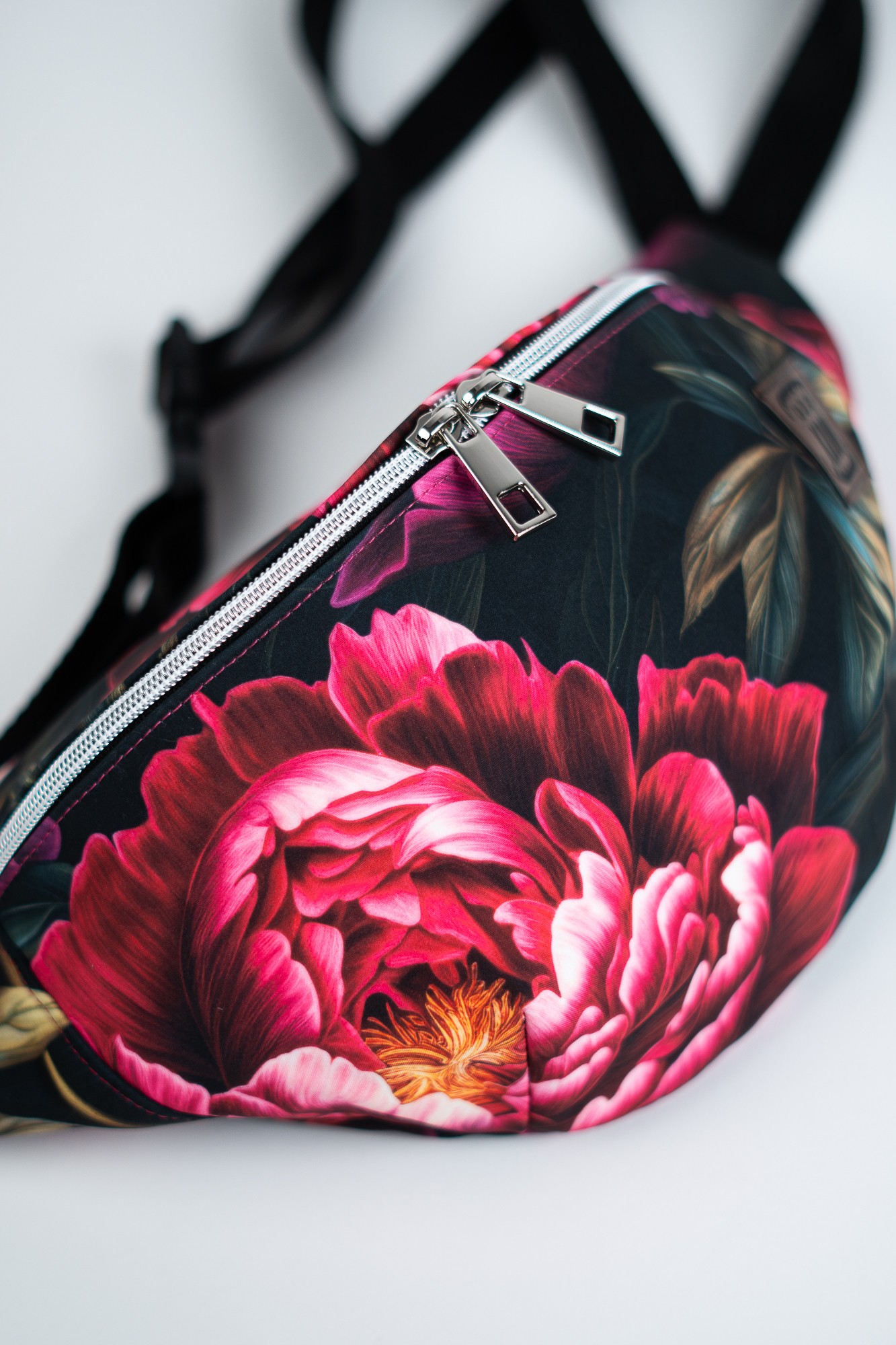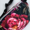 Czarna sportowa nerka damska saszetka w kwiaty peonie DOTYK PEONII