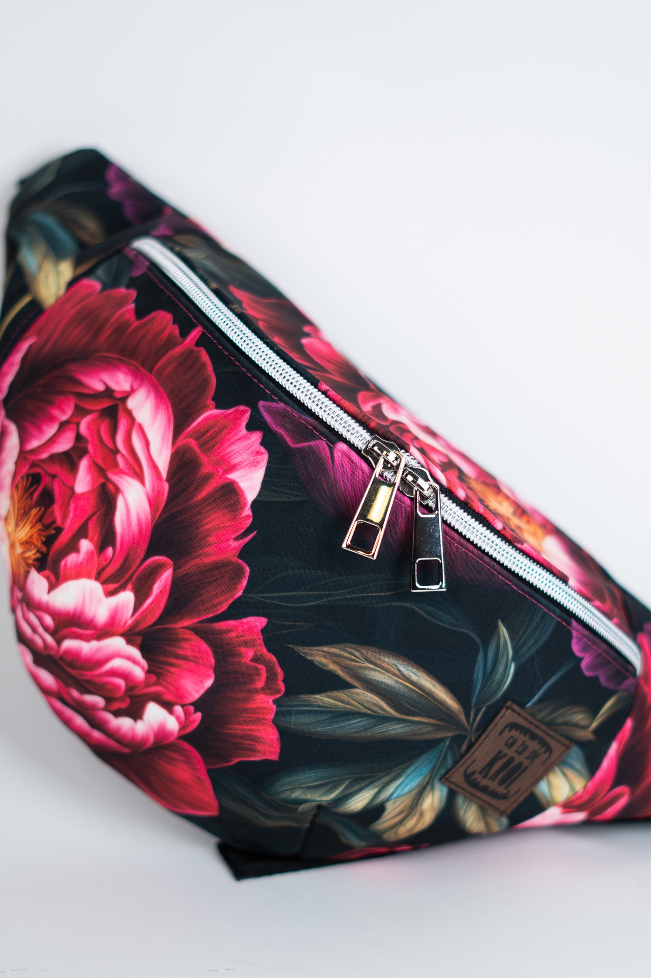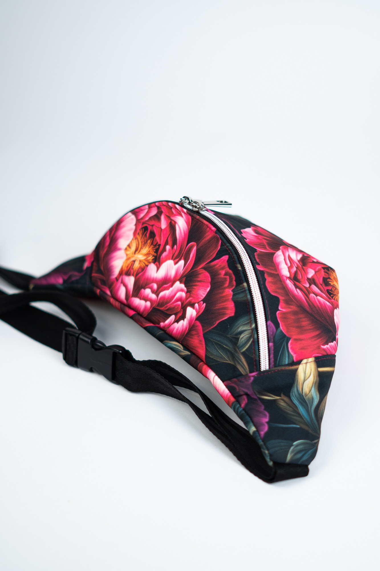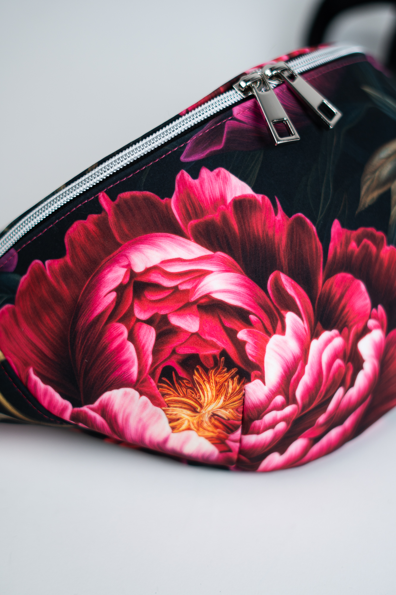 Czarna sportowa nerka damska saszetka w kwiaty peonie DOTYK PEONII
