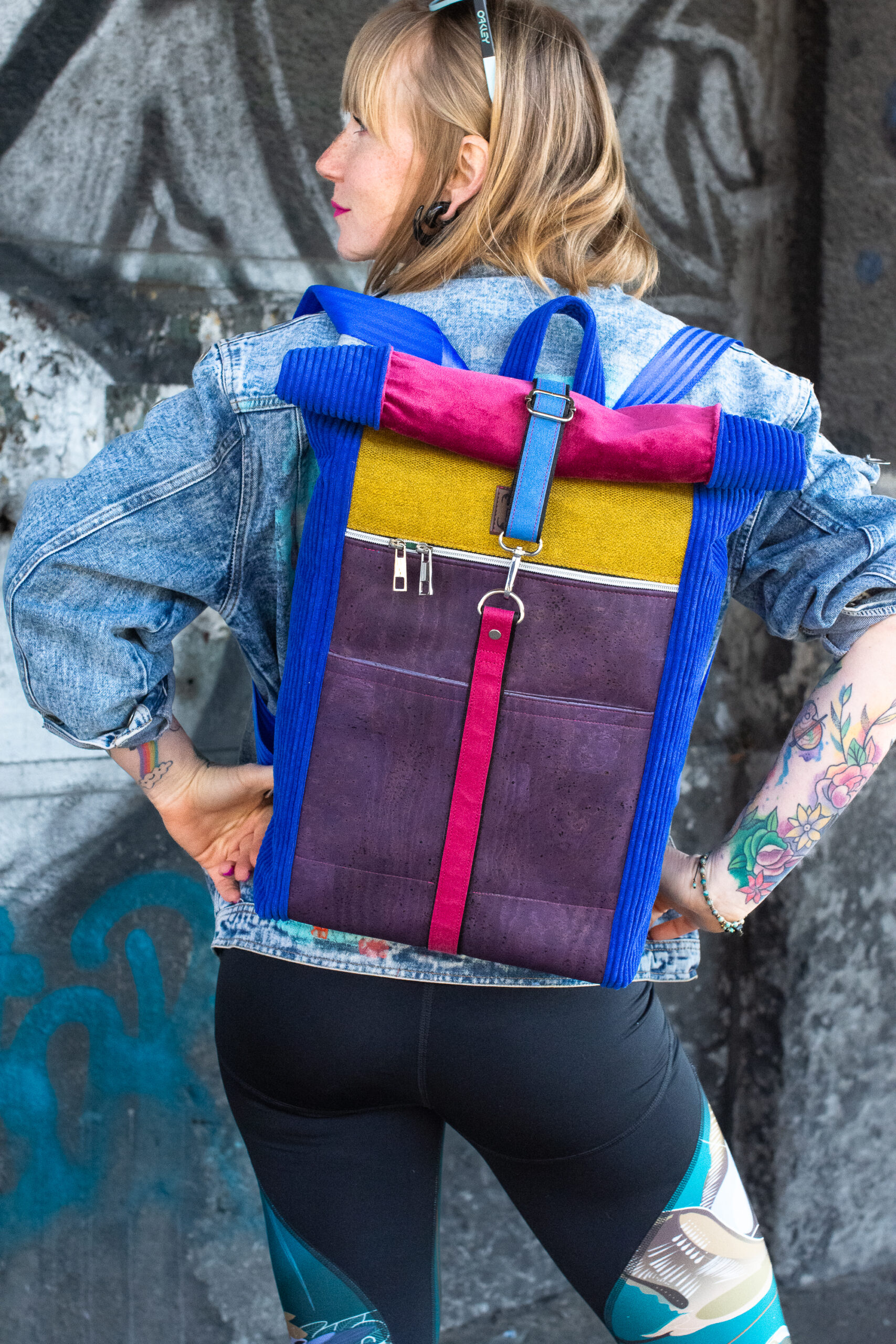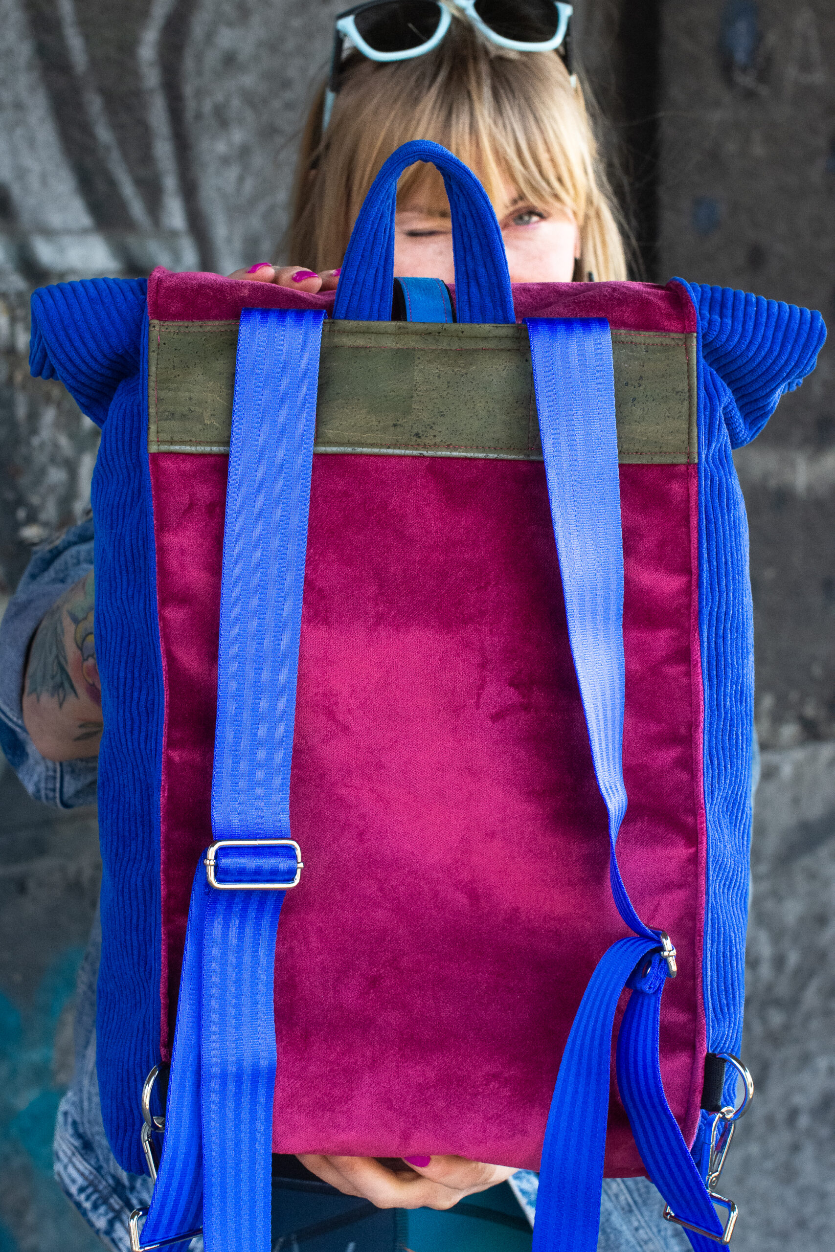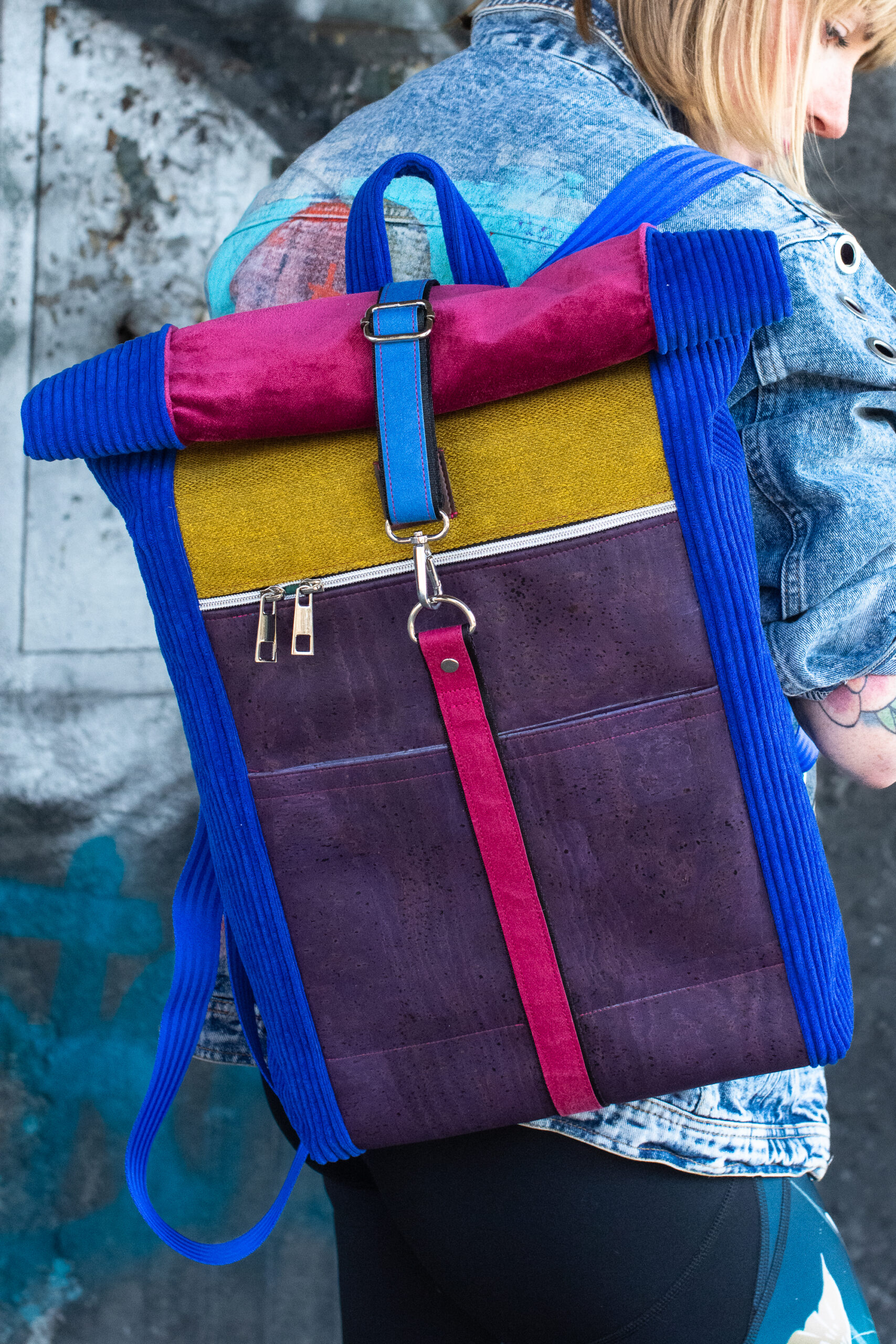 - Elektryzujący Niebieski Sztruks: Boki plecaka to wytrzymały, gruby sztruks w kolorze intensywnego błękitu kobaltowego. Jego pionowe prążki optycznie wysmuklają sylwetkę plecaka i dodają mu unikatowej tekstury.