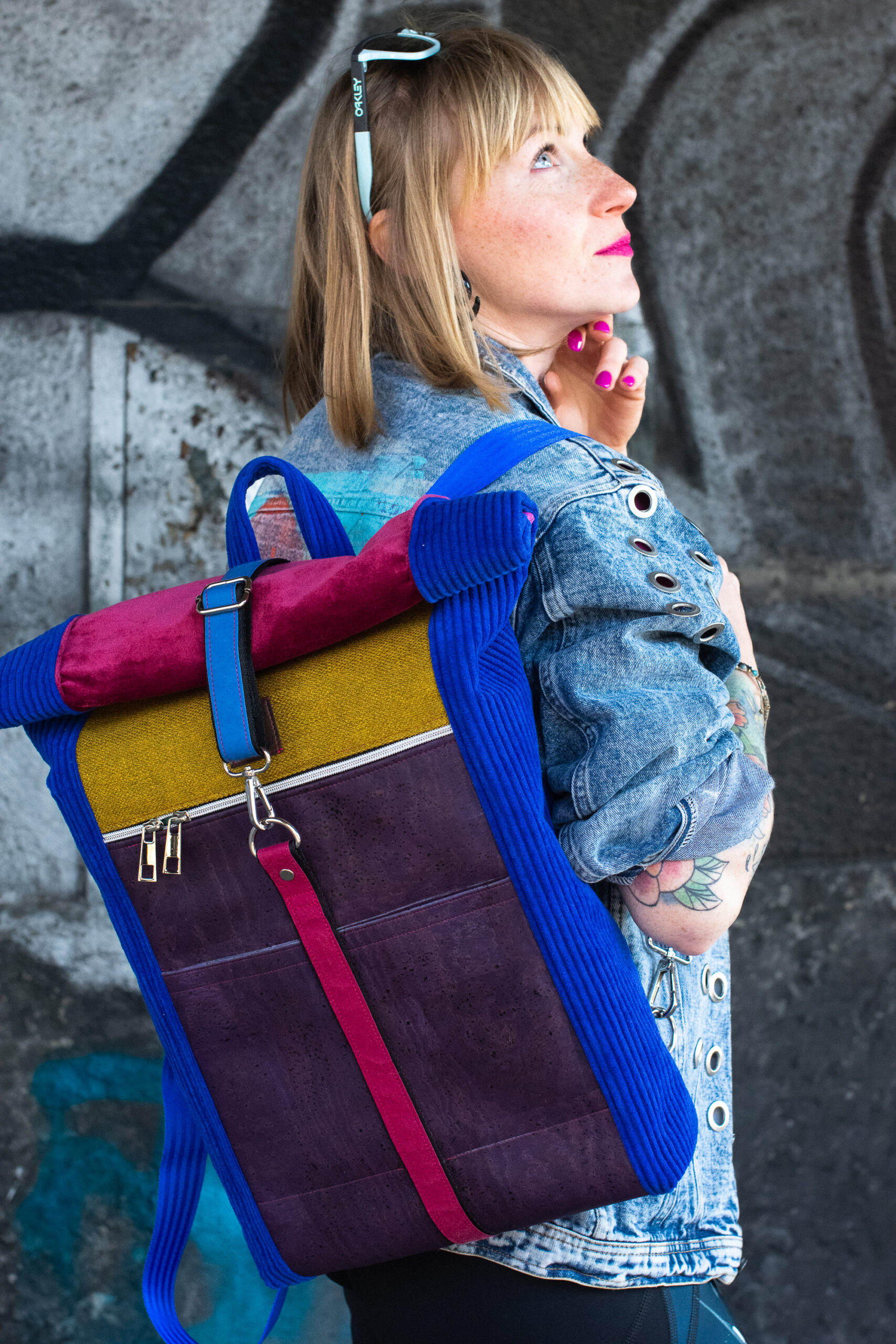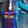 - Cytrynowa Energia i Burgundowy Aksamit: Środkowy panel z grubo tkanej, żółtej tkaniny tapicerskiej rozświetla projekt, nadając mu optymizmu. Powyżej znajdziesz miękki, niemal zamszowy w dotyku materiał w kolorze szlachetnego burgundu, który wieńczy górną część plecaka.