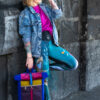 - Fuksjowy Akcent: Pionowy pas na froncie w kolorze intensywnego różu (fuksji) stanowi odważne przełamanie chłodnej bazy, przyciągając wzrok do srebrnych, metalowych okuć i karabińczyka.