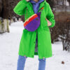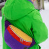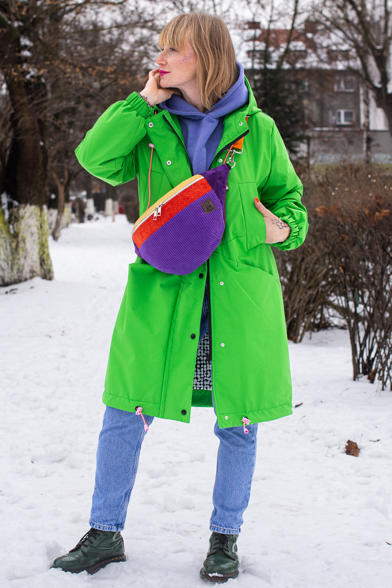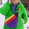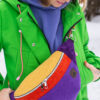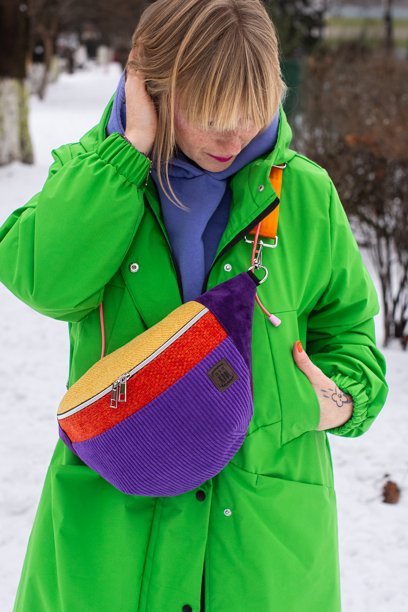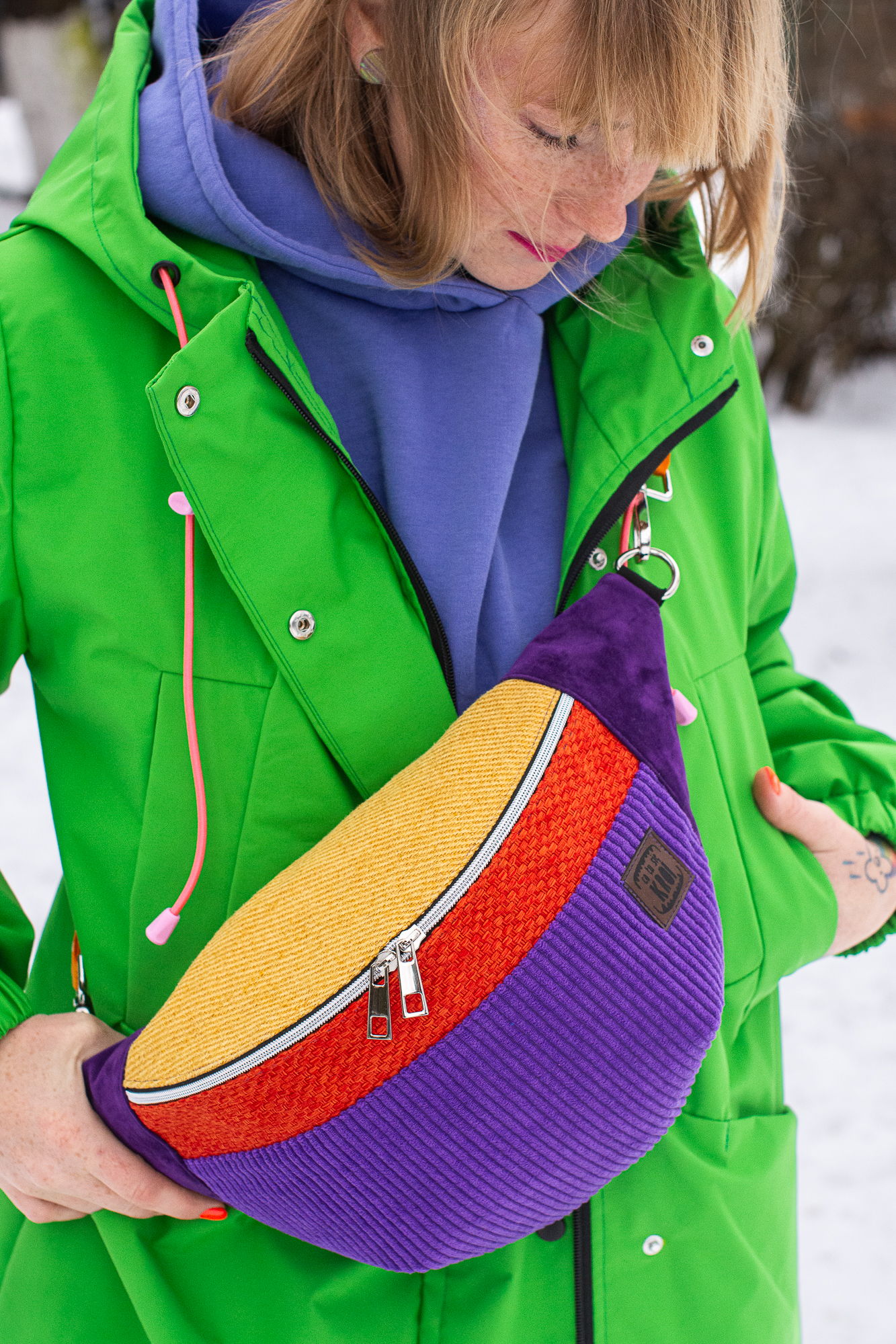 Ta kolorowa nerka dla kobiety to dodatek całoroczny. Rewelacyjnie odcina się na tle ciemnych płaszczy, ale jak widzisz na zdjęciu – tworzy też obłędny kontrast z neonową zielenią czy fioletem bluzy. To produkt dla kobiet, które nie boją się eksperymentować z modą i cenią polskie rzemiosło.