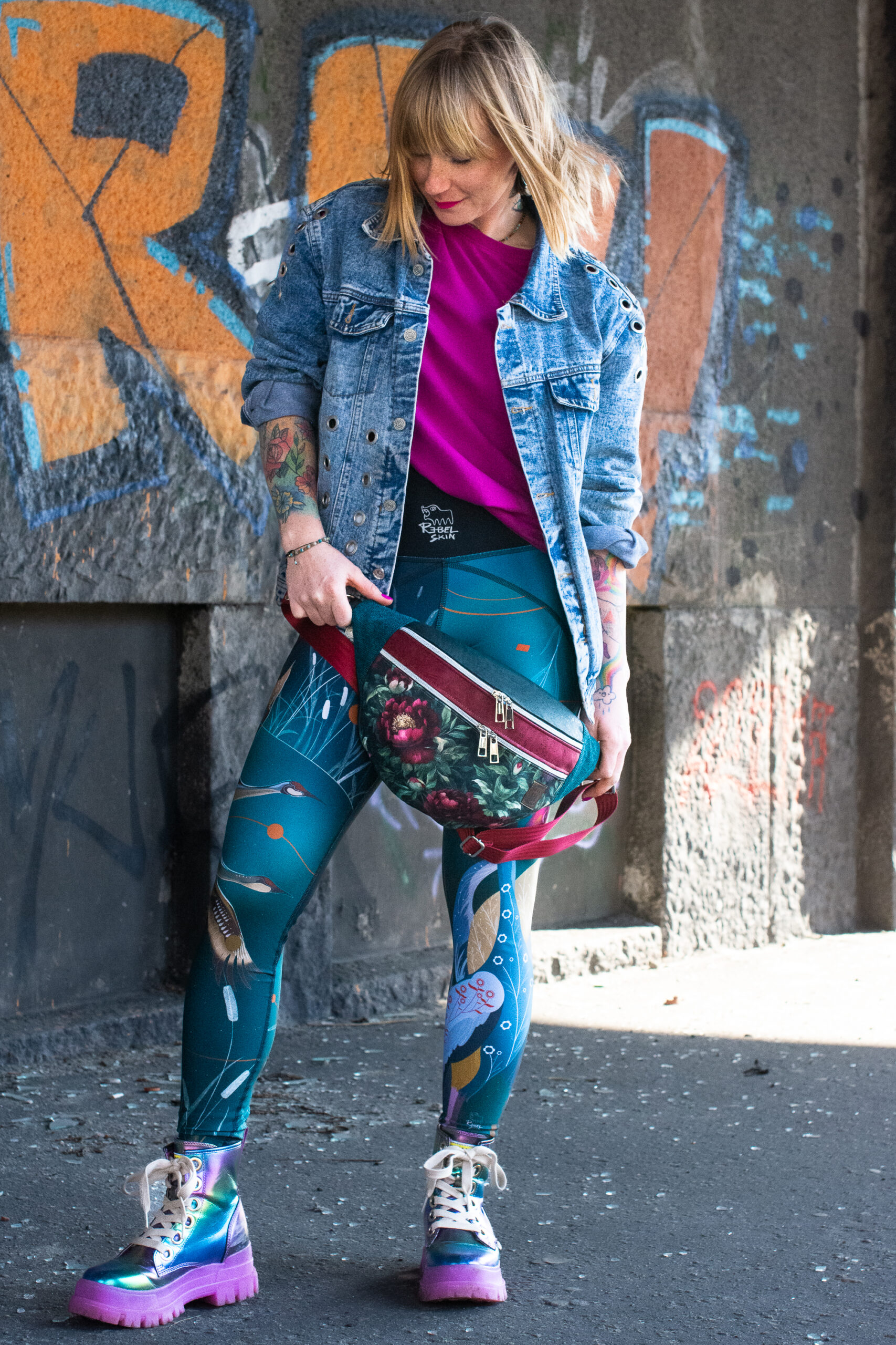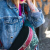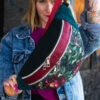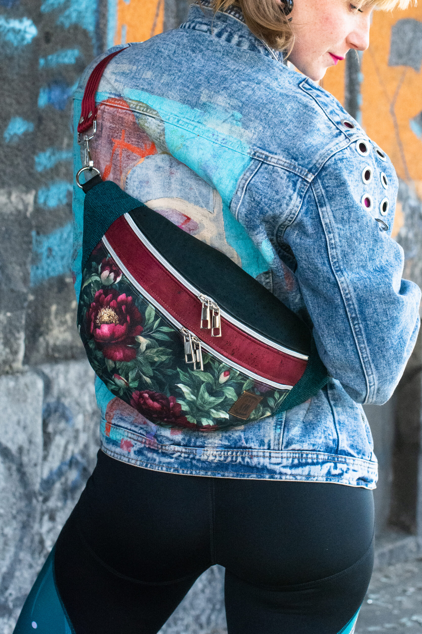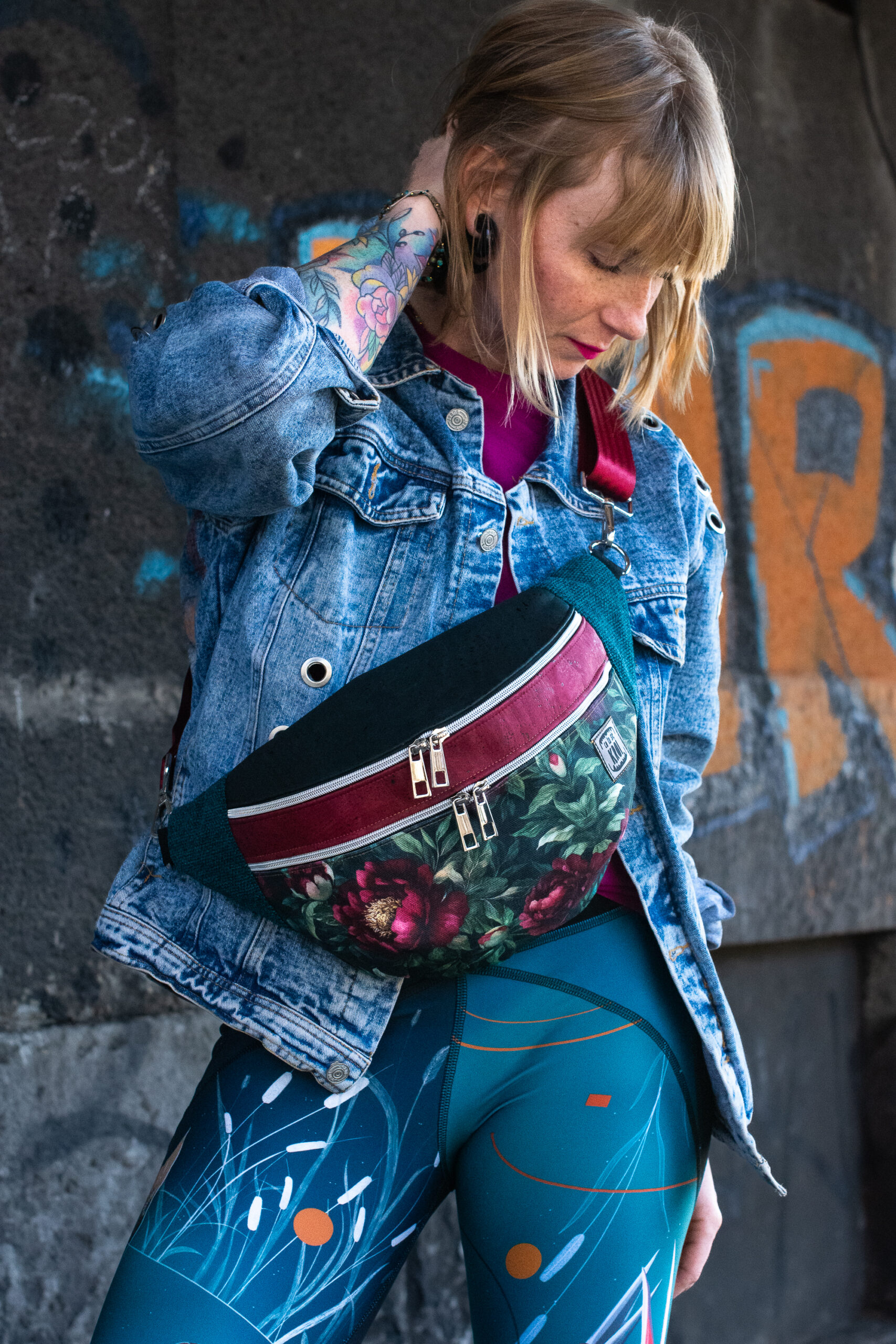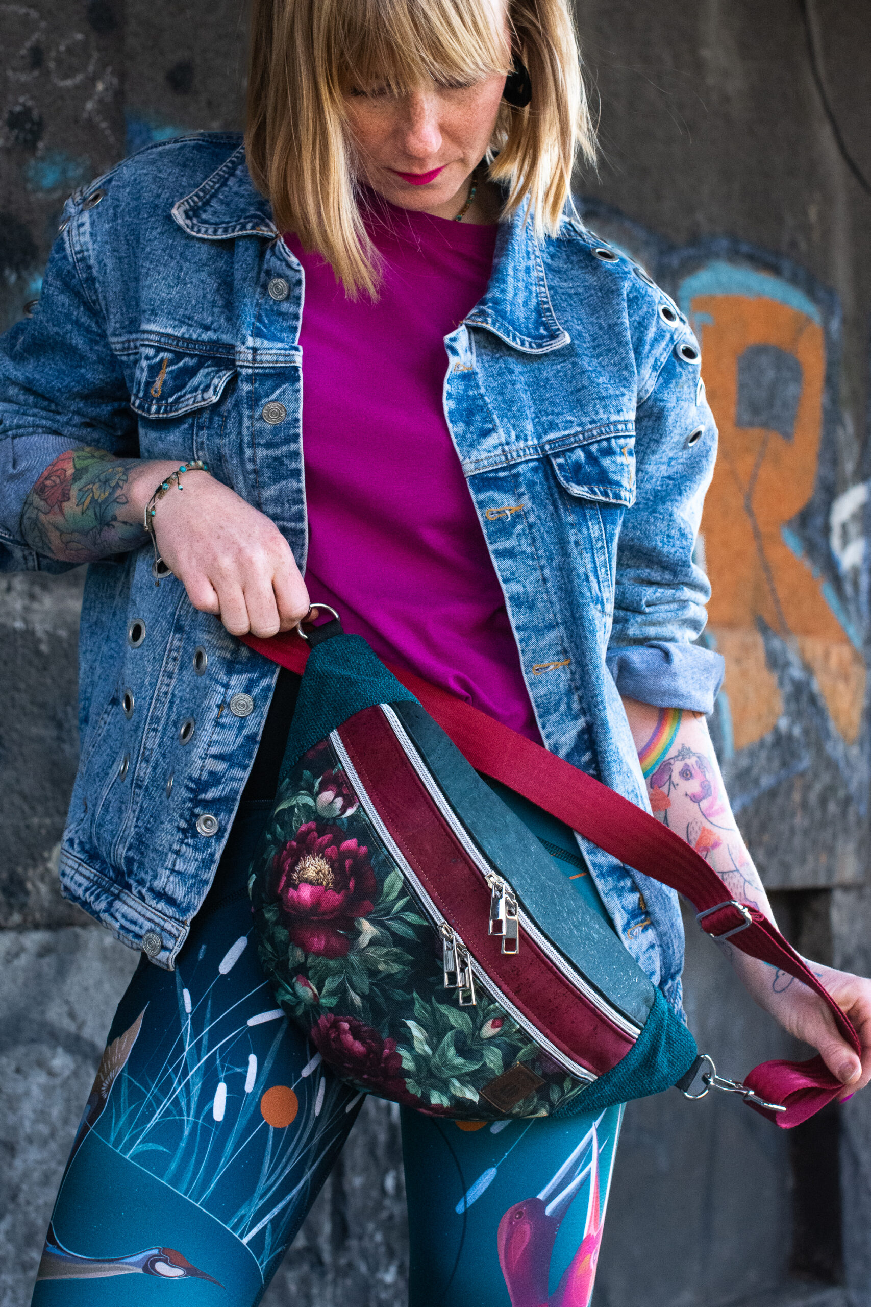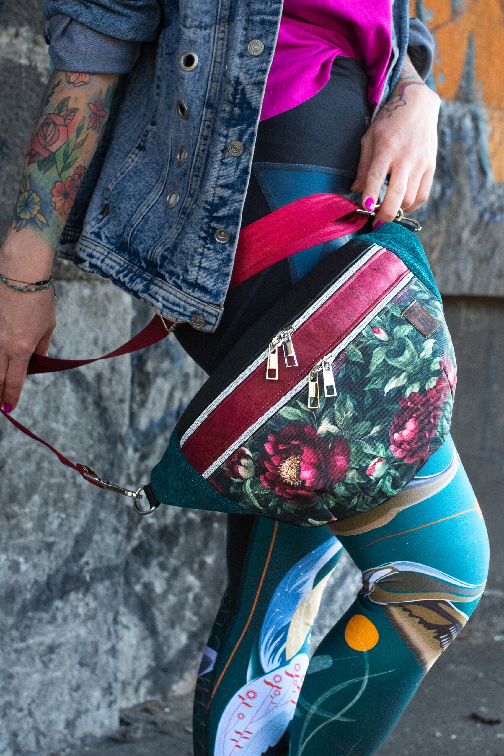 Motyw „Barwnej Ciszy” to głęboka, butelkowa zieleń tła, na której rozkwitają ciemnoczerwone piwonie. To wzór, który uspokaja, a jednocześnie dodaje energii. Tekstylna struktura materiału (widoczna na bokach nerki) nadaje jej unikalnego, rzemieślniczego charakteru, który świetnie kontrastuje z jeansową kurtką czy sportowym outfitem.