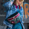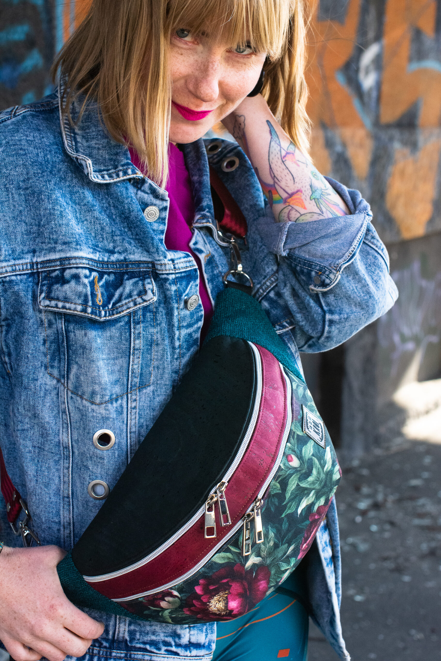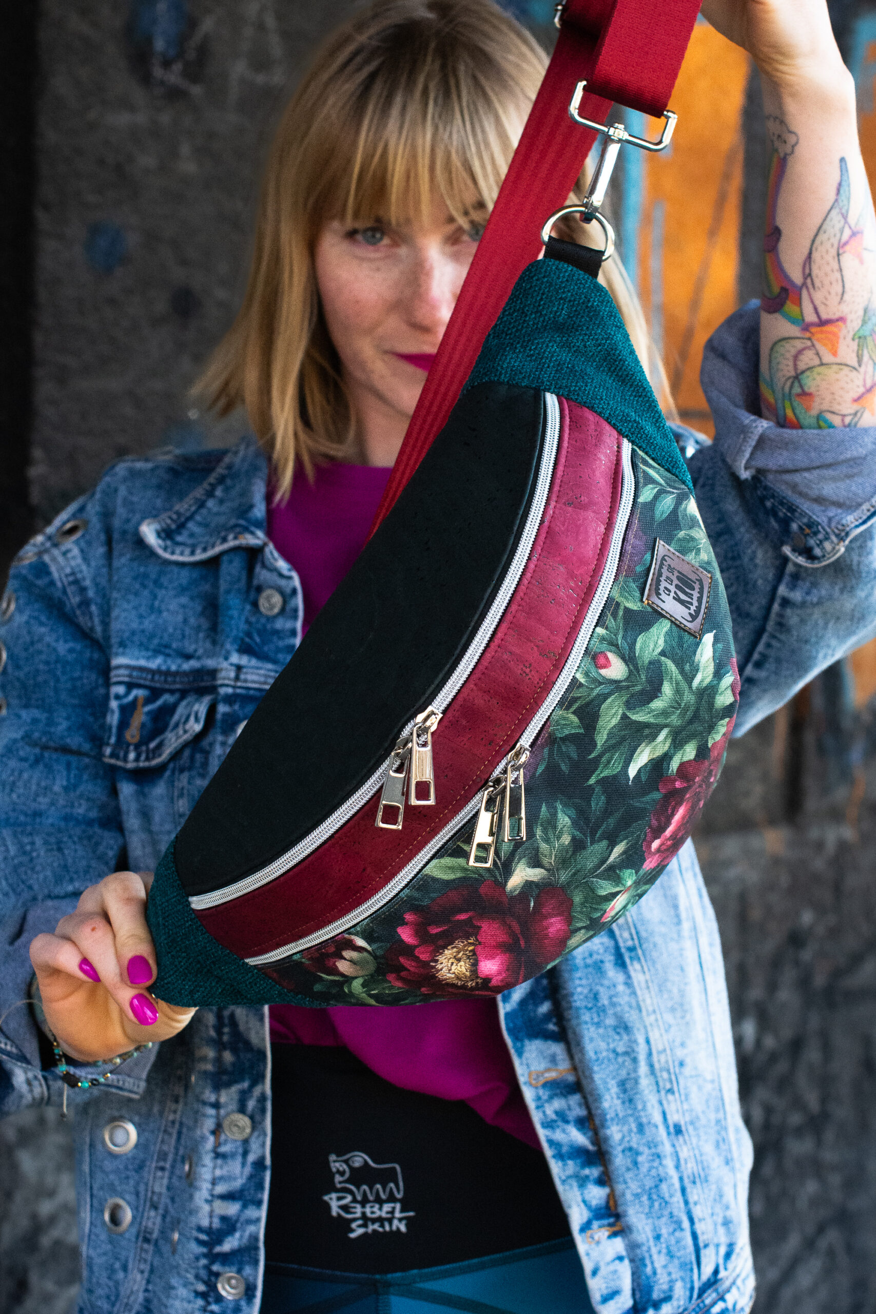 MATERIAŁ: drukowana gabardyna, tkanina tapicerska, tkanina korkowa, kolorowa podszewka z kieszonką na suwak, ozdobny, kolorowy pasek 38 mm