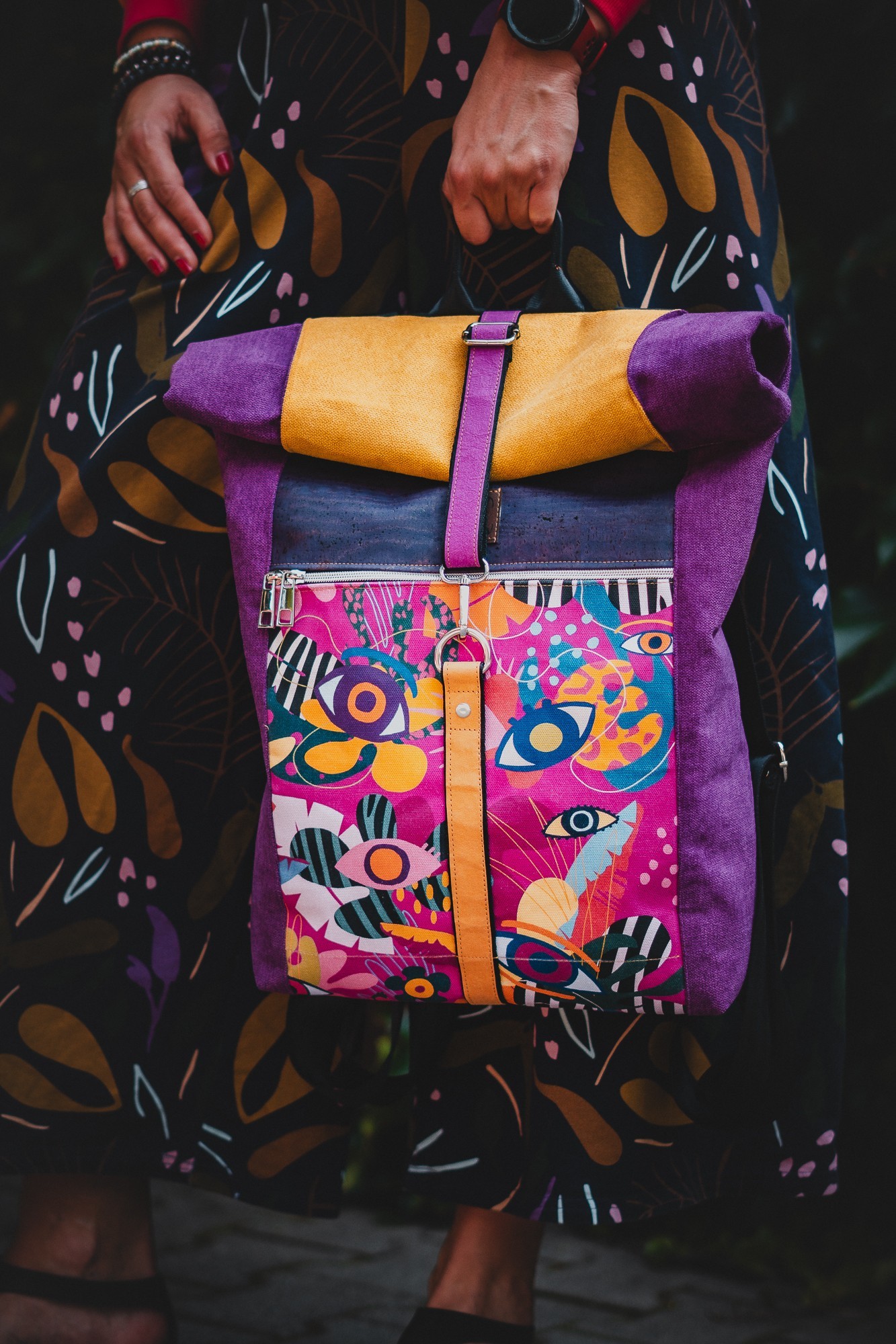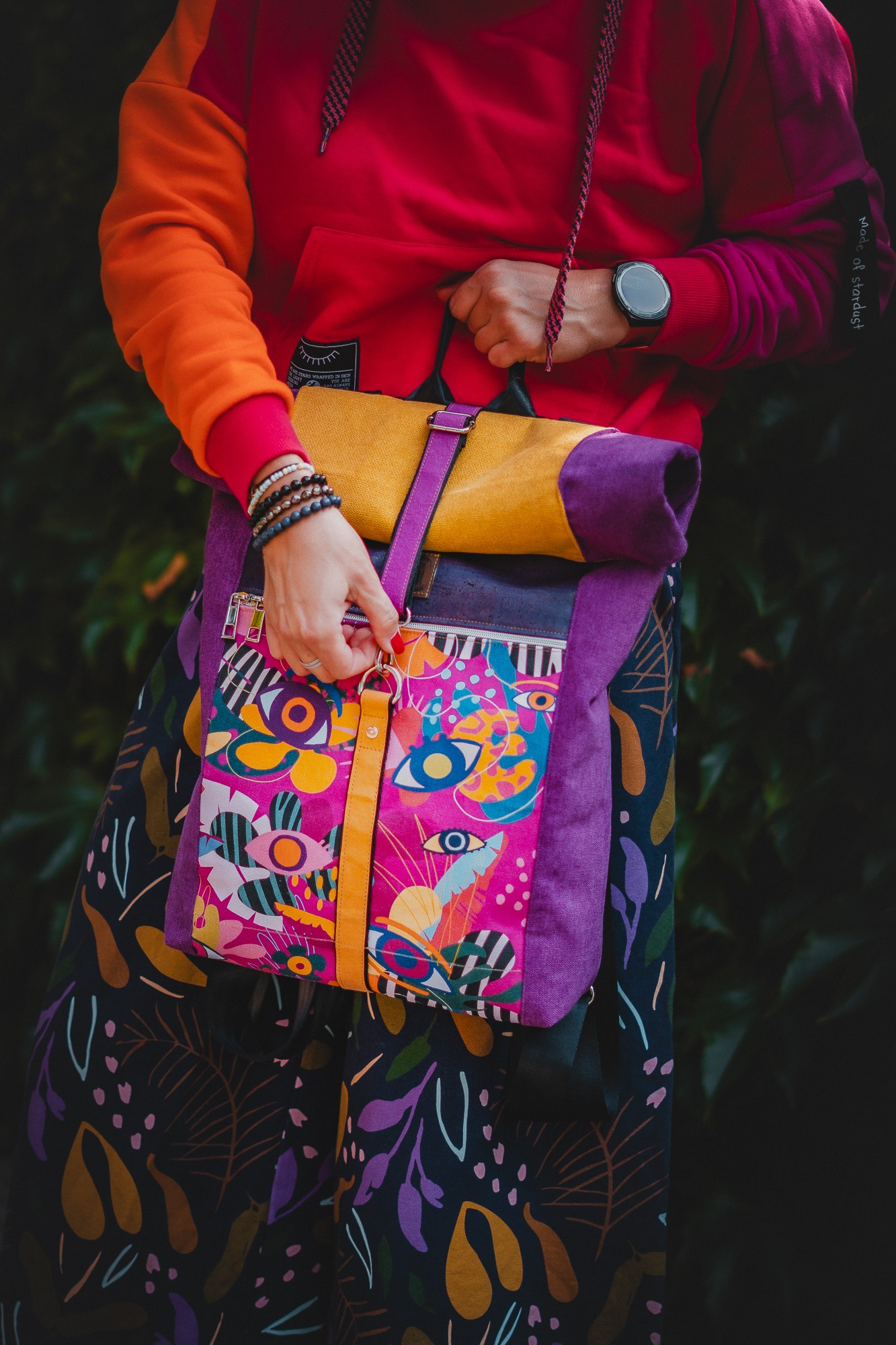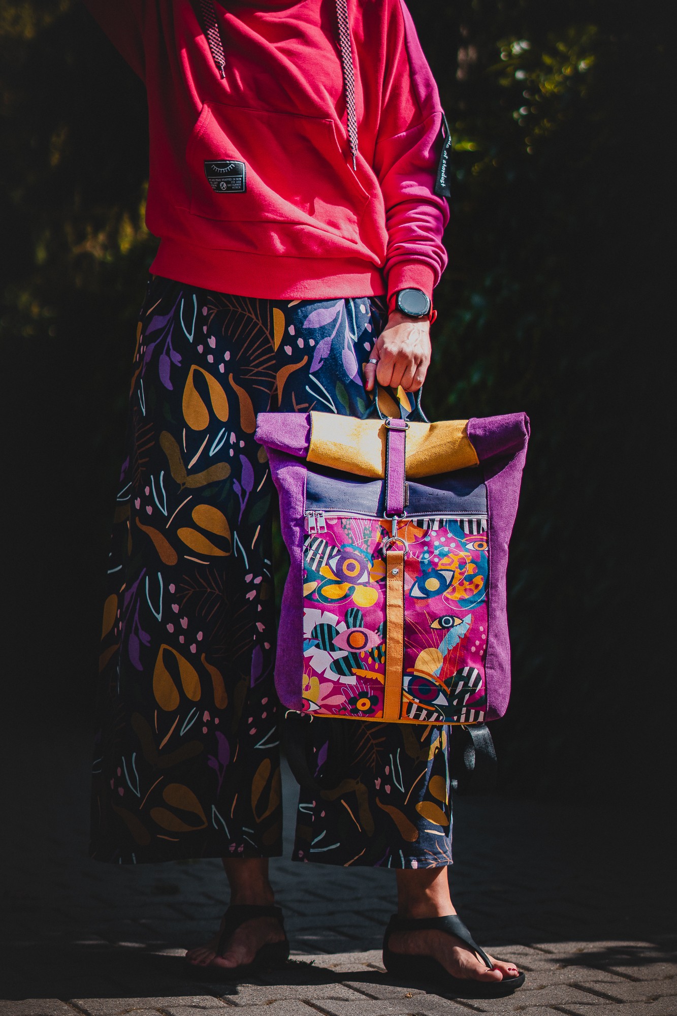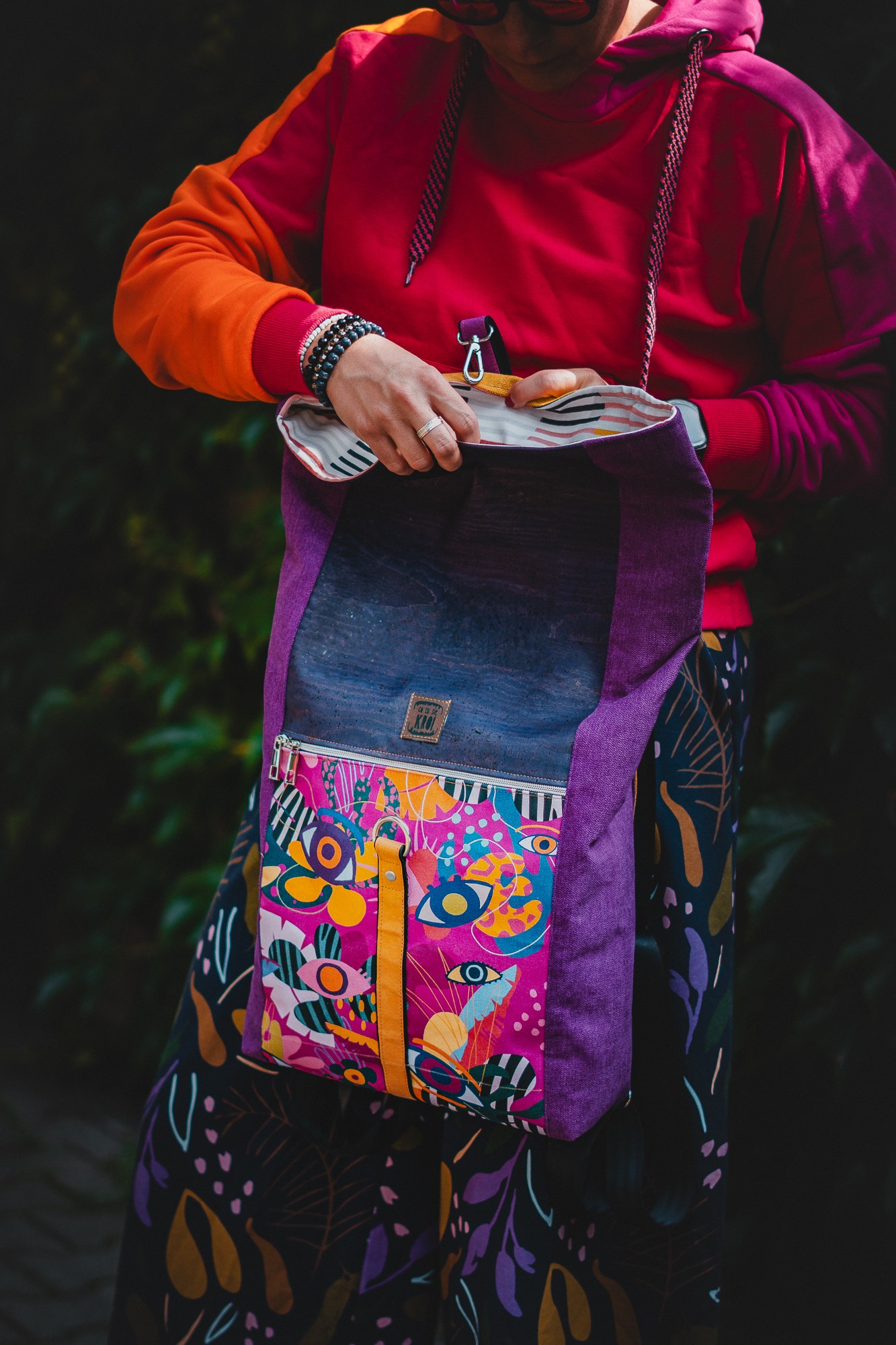 Szukasz czegoś, co wyróżni Cię w tłumie i jednocześnie będzie praktyczne? Ten plecak damski z kolekcji Magiczne Spojrzenie to propozycja dla kobiet, które lubią nietuzinkowe dodatki, funkcjonalność i artystyczny charakter. Projekt powstał specjalnie na zlecenie marki Co Tu Się Kroi – każdy element wzoru został starannie dopracowany, by tworzyć unikalną, autorską kompozycję. Pierwsze, co przyciąga uwagę, to kolorystyka. Intensywne fiolety, głęboki granat i mocny akcent w odcieniu musztardowej żółci przełamane zostały dużą, kolorową kieszenią frontową. Wzór na niej to artystyczna eksplozja barw – róż, pomarańcz, turkus, elementy w stylu graficznym i geometrycznym. Całość tworzy efekt kolorowego plecaka damskiego, który idealnie pasuje do energicznych, kreatywnych osobowości. Plecak ma konstrukcję typu kurierskiego – czyli wygodne, pojemne wnętrze z możliwością rolowania i regulacji wysokości. Dzięki temu świetnie sprawdzi się zarówno na co dzień, jak i w podróży, w pracy czy na uczelni. Zmieścisz w nim laptopa, dokumenty, butelkę wody czy zakupy – a przy tym zachowasz swobodę i komfort noszenia. Solidne szelki, mocne przeszycia i trwałe materiały sprawiają, że plecak posłuży Ci przez długi czas. To nie tylko praktyczny dodatek, ale i prawdziwa ozdoba każdej stylizacji. Pasuje zarówno do miejskich, casualowych looków, jak i bardziej sportowych zestawów. Jeśli chcesz, by Twój plecak damski był czymś więcej niż tylko torbą – by był wyrazem Twojej osobowości – Magiczne Spojrzenie to wybór dla Ciebie. Wybierając ten model, stawiasz na oryginalność, ręczną pracę i wzór, którego nie znajdziesz w żadnej masowej sieciówce. To kolorowy plecak damski handmade, wykonany z pasją i dbałością o każdy detal.