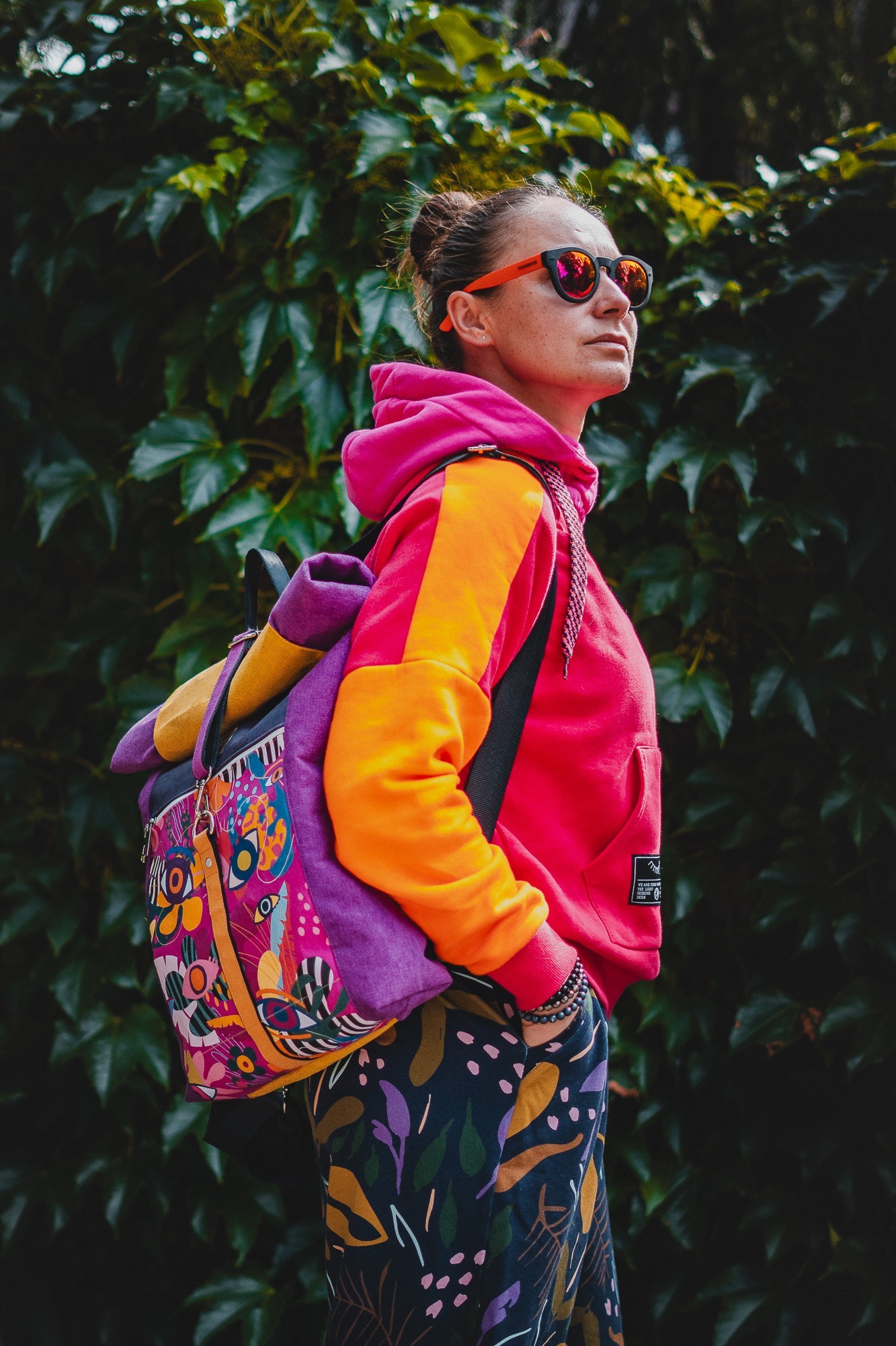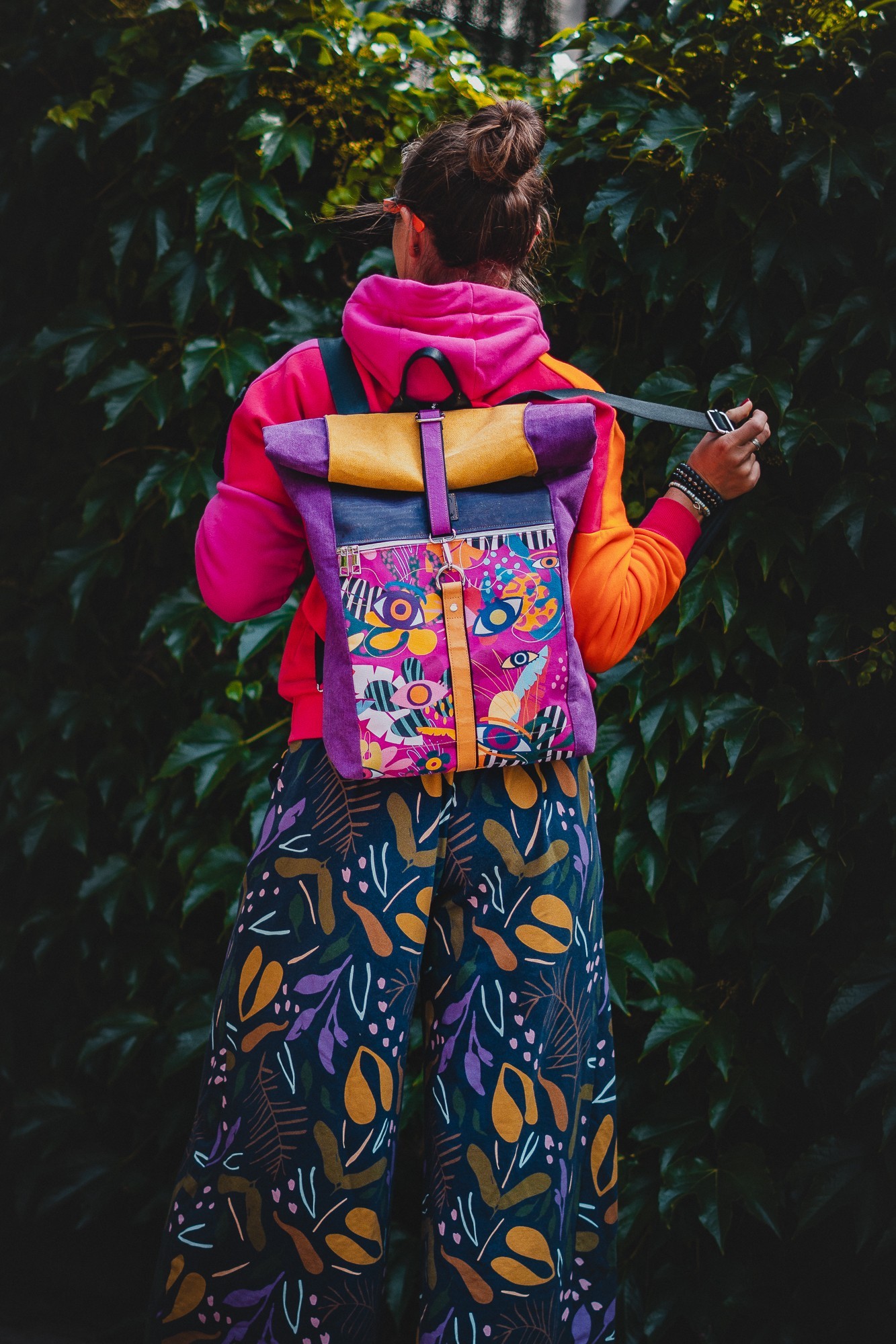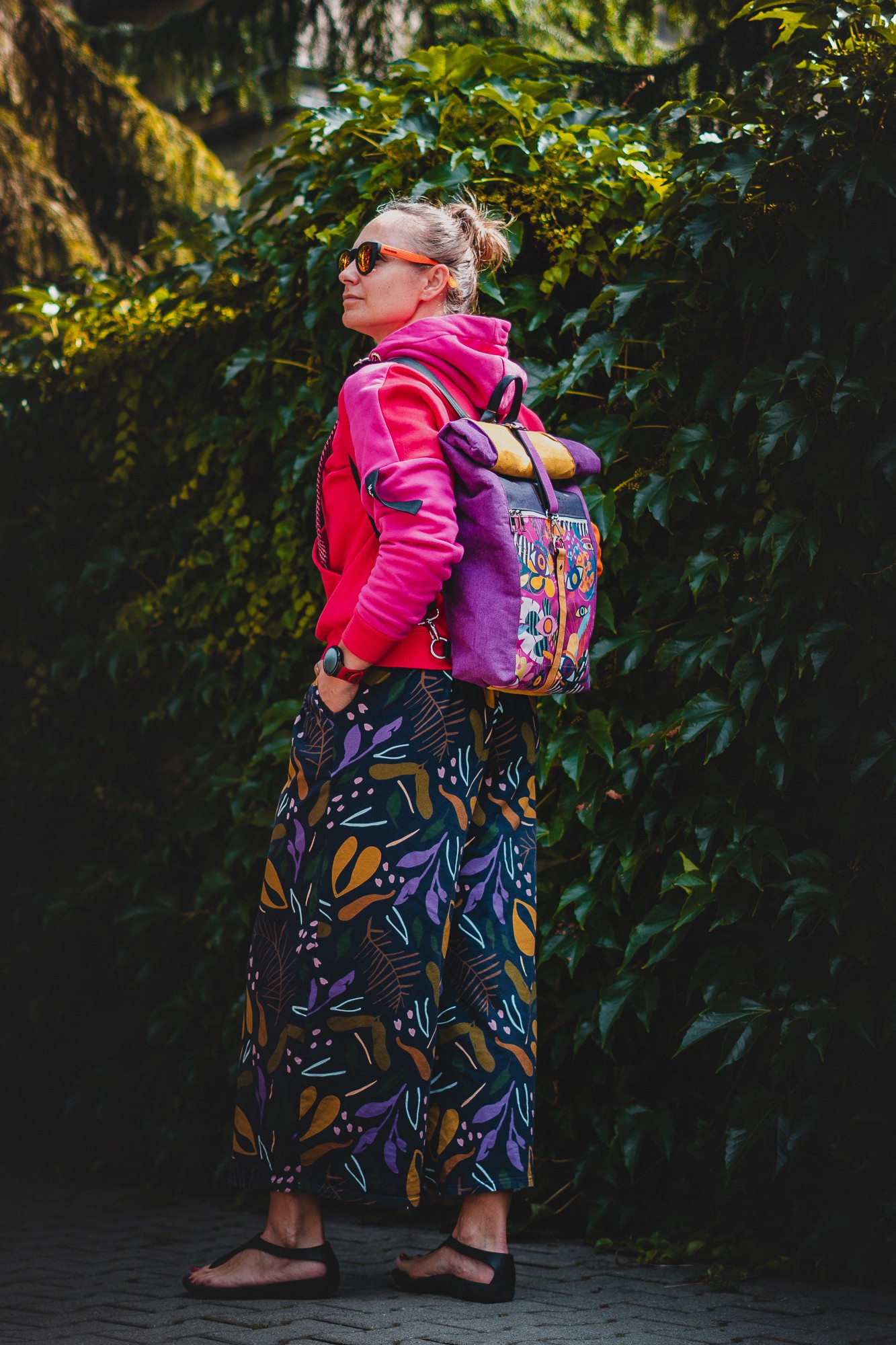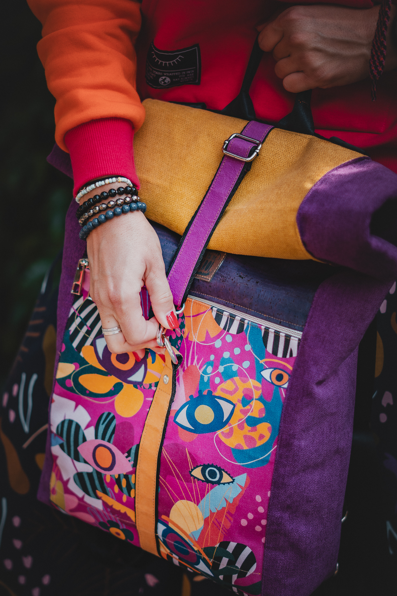 Szukasz czegoś, co wyróżni Cię w tłumie i jednocześnie będzie praktyczne? Ten plecak damski z kolekcji Magiczne Spojrzenie to propozycja dla kobiet, które lubią nietuzinkowe dodatki, funkcjonalność i artystyczny charakter. Projekt powstał specjalnie na zlecenie marki Co Tu Się Kroi – każdy element wzoru został starannie dopracowany, by tworzyć unikalną, autorską kompozycję. Pierwsze, co przyciąga uwagę, to kolorystyka. Intensywne fiolety, głęboki granat i mocny akcent w odcieniu musztardowej żółci przełamane zostały dużą, kolorową kieszenią frontową. Wzór na niej to artystyczna eksplozja barw – róż, pomarańcz, turkus, elementy w stylu graficznym i geometrycznym. Całość tworzy efekt kolorowego plecaka damskiego, który idealnie pasuje do energicznych, kreatywnych osobowości. Plecak ma konstrukcję typu kurierskiego – czyli wygodne, pojemne wnętrze z możliwością rolowania i regulacji wysokości. Dzięki temu świetnie sprawdzi się zarówno na co dzień, jak i w podróży, w pracy czy na uczelni. Zmieścisz w nim laptopa, dokumenty, butelkę wody czy zakupy – a przy tym zachowasz swobodę i komfort noszenia. Solidne szelki, mocne przeszycia i trwałe materiały sprawiają, że plecak posłuży Ci przez długi czas. To nie tylko praktyczny dodatek, ale i prawdziwa ozdoba każdej stylizacji. Pasuje zarówno do miejskich, casualowych looków, jak i bardziej sportowych zestawów. Jeśli chcesz, by Twój plecak damski był czymś więcej niż tylko torbą – by był wyrazem Twojej osobowości – Magiczne Spojrzenie to wybór dla Ciebie. Wybierając ten model, stawiasz na oryginalność, ręczną pracę i wzór, którego nie znajdziesz w żadnej masowej sieciówce. To kolorowy plecak damski handmade, wykonany z pasją i dbałością o każdy detal.
