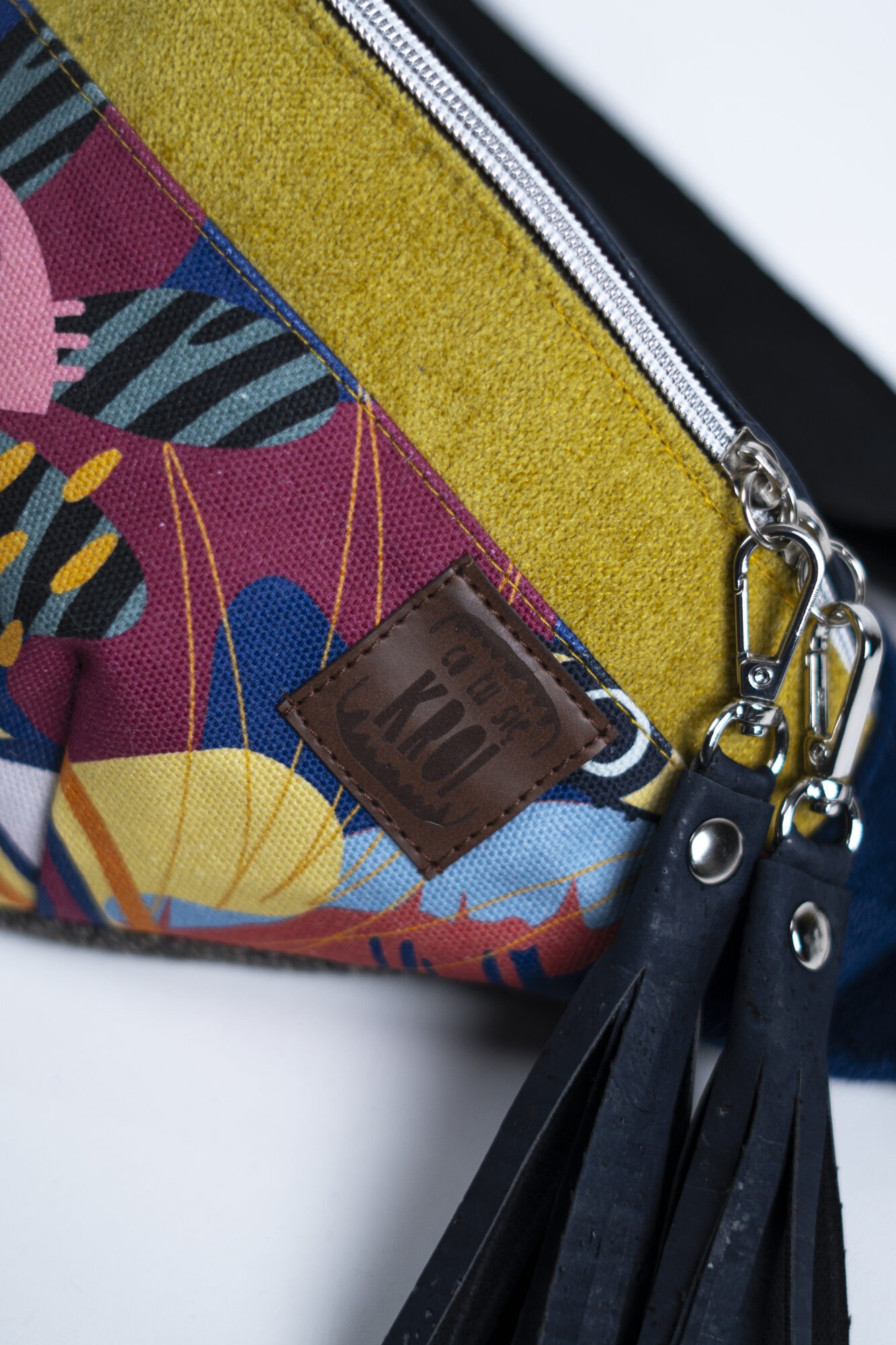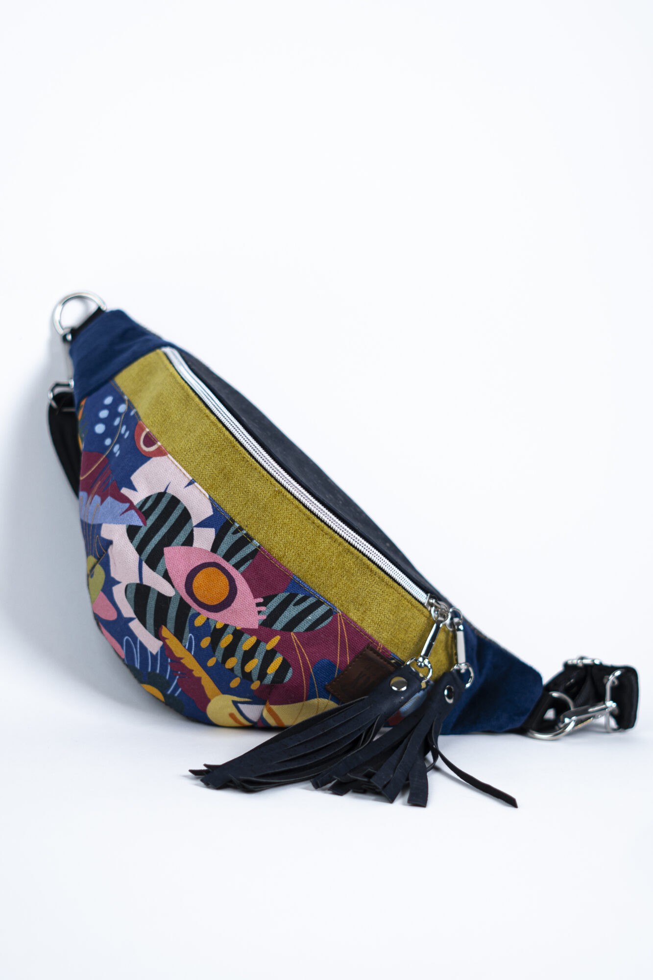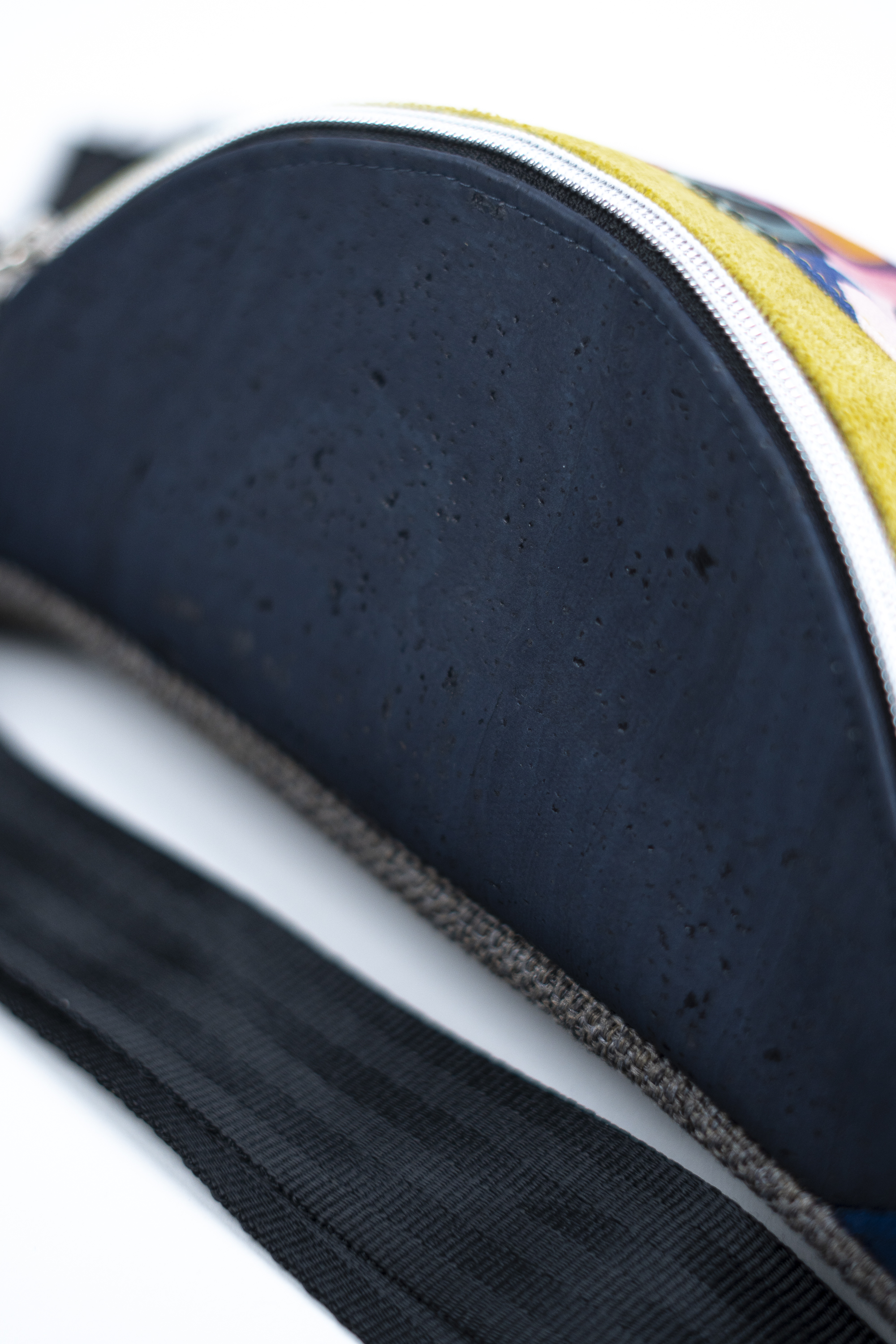 MATERIAŁ: kolorowa tkanina korkowa, drukowana gabardyna bawełniana 272 g/m2, tkanina tapicerska, wersja z bawełnianą podszewką 125 g/m2, pas samochodowy czarny 38 mm.