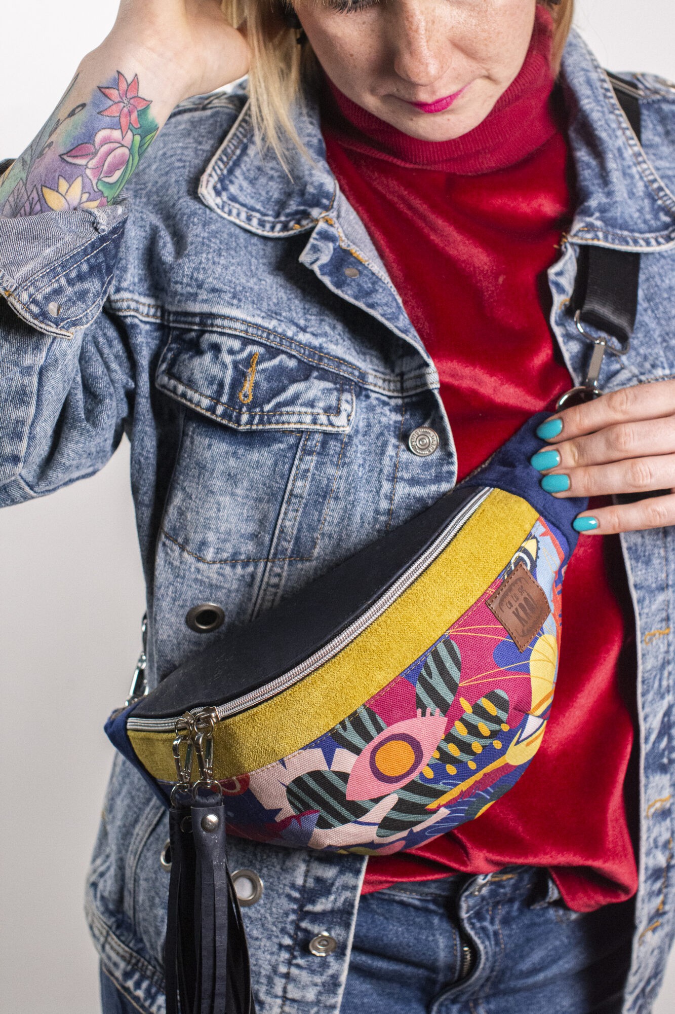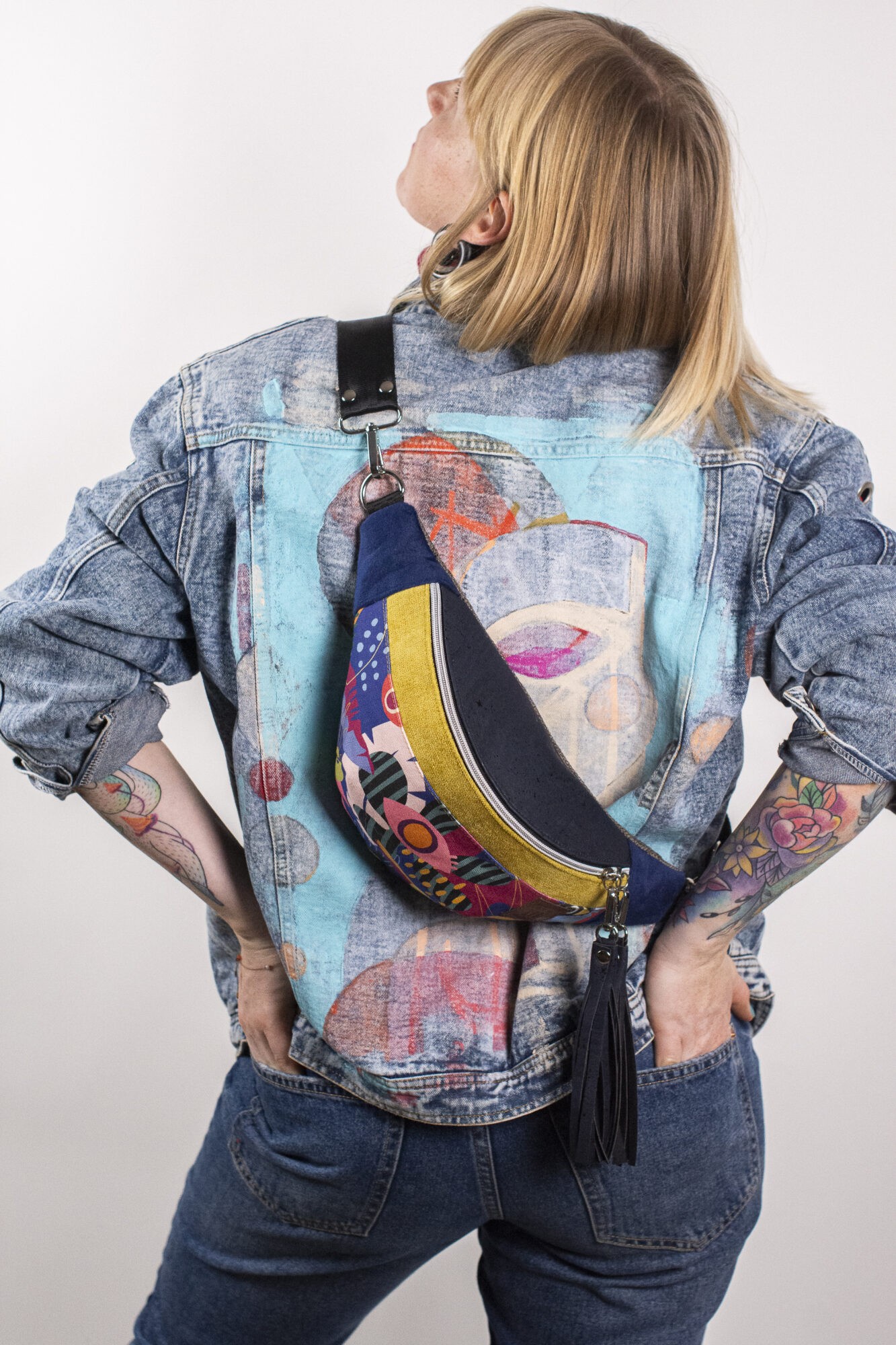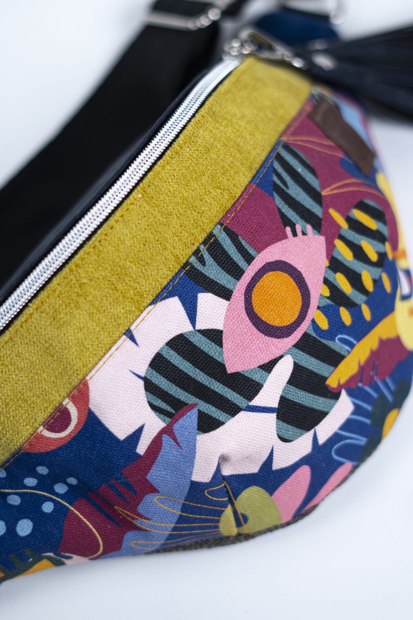 MATERIAŁ: kolorowa tkanina korkowa, drukowana gabardyna bawełniana 272 g/m2, tkanina tapicerska, wersja z bawełnianą podszewką 125 g/m2, pas samochodowy czarny 38 mm.