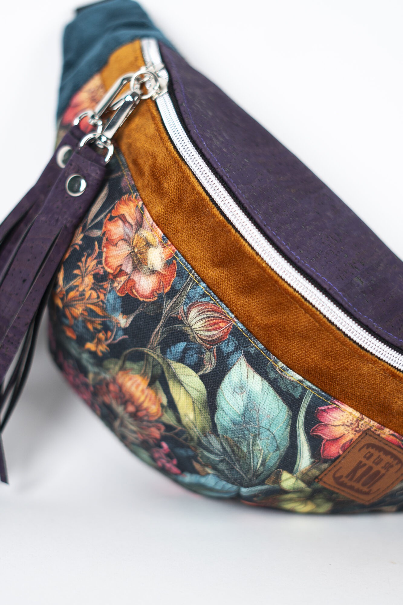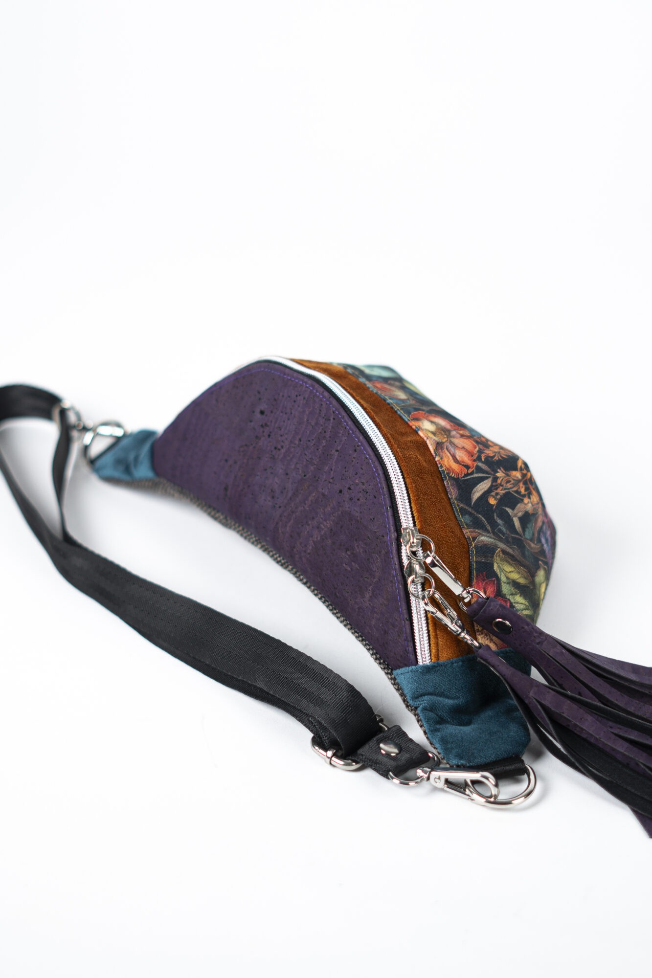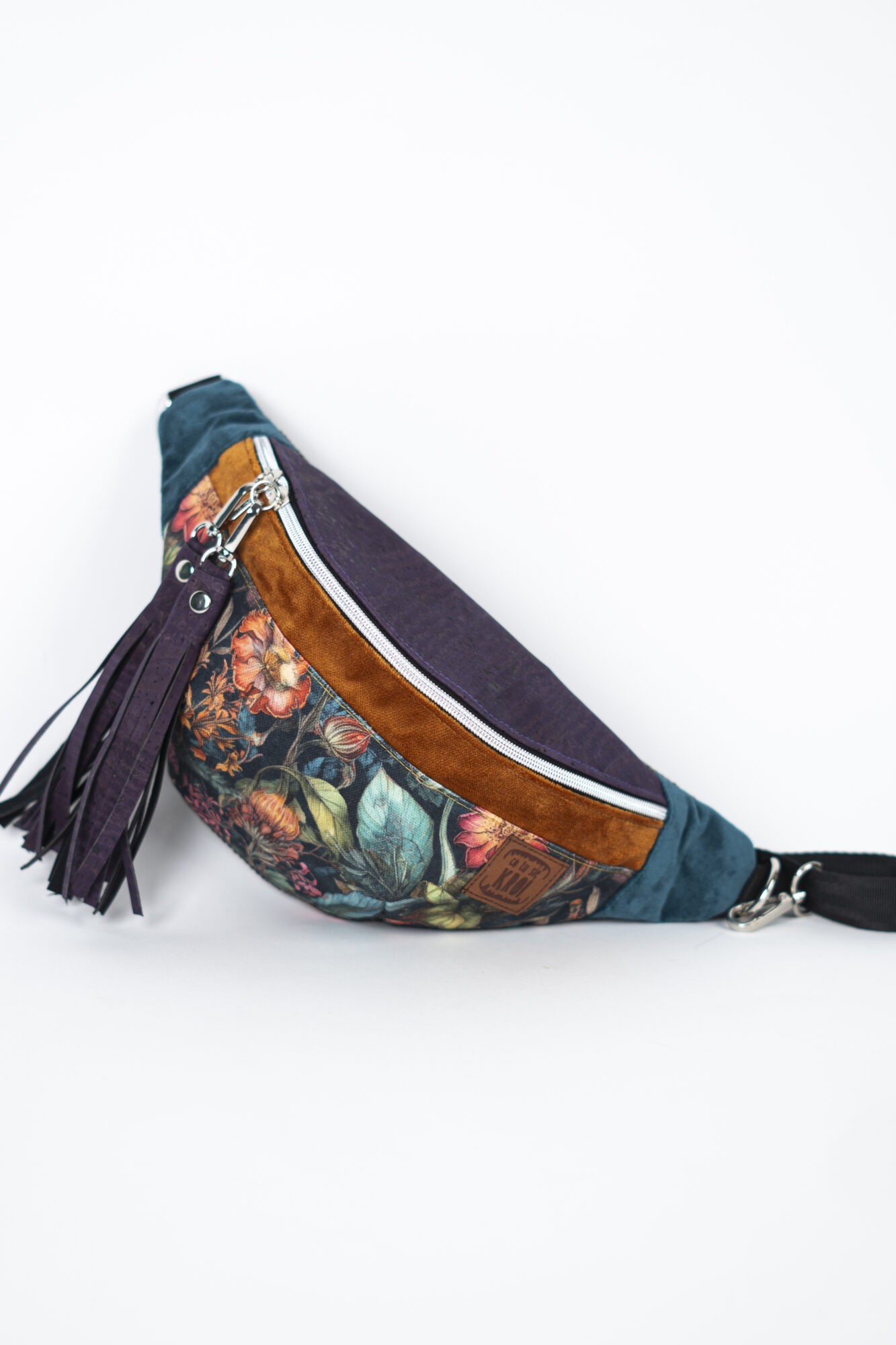 Nerka wyróżnia się zachwycającym kwiatowym wzorem, który przyciąga wzrok i dodaje energii każdej stylizacji. Wykonana z wysokiej jakości materiałów, nerka jest zarówno trwała, jak i elegancka. Klapka, stworzona z tkaniny korkowej w intensywnym kolorze fioletu, nadaje jej wyjątkowego charakteru, a dodatkowe ozdobne frędzle przy zamku dodają całości szyku i oryginalności.