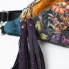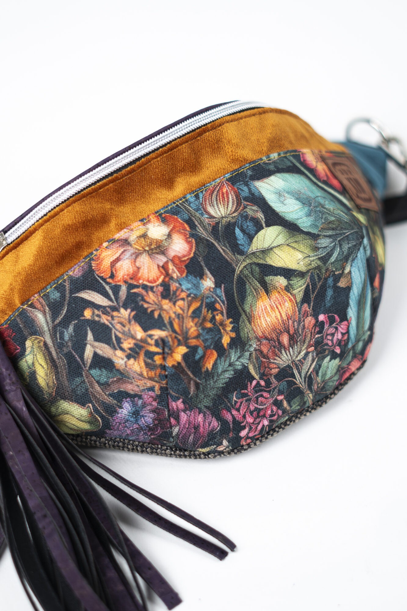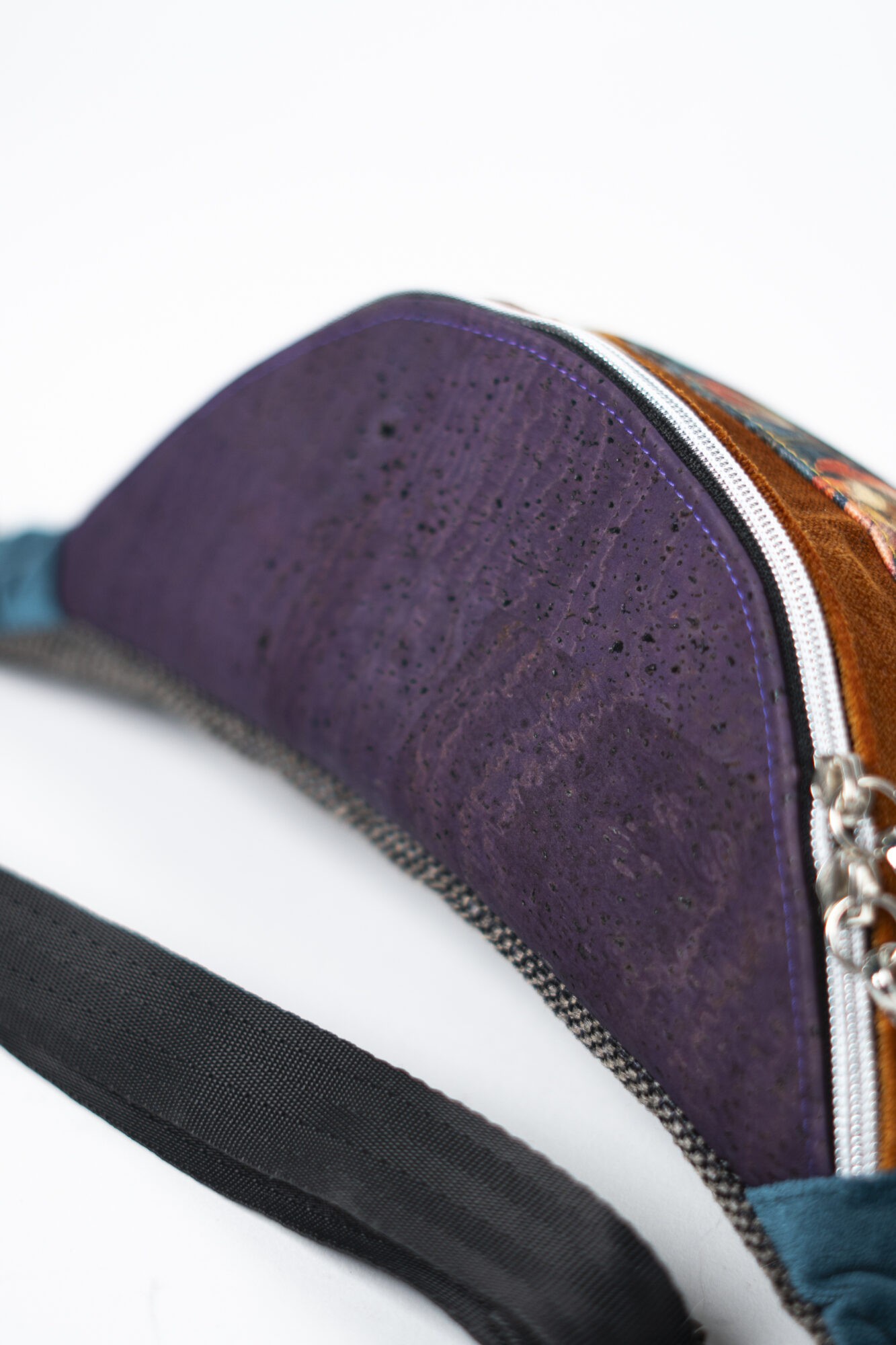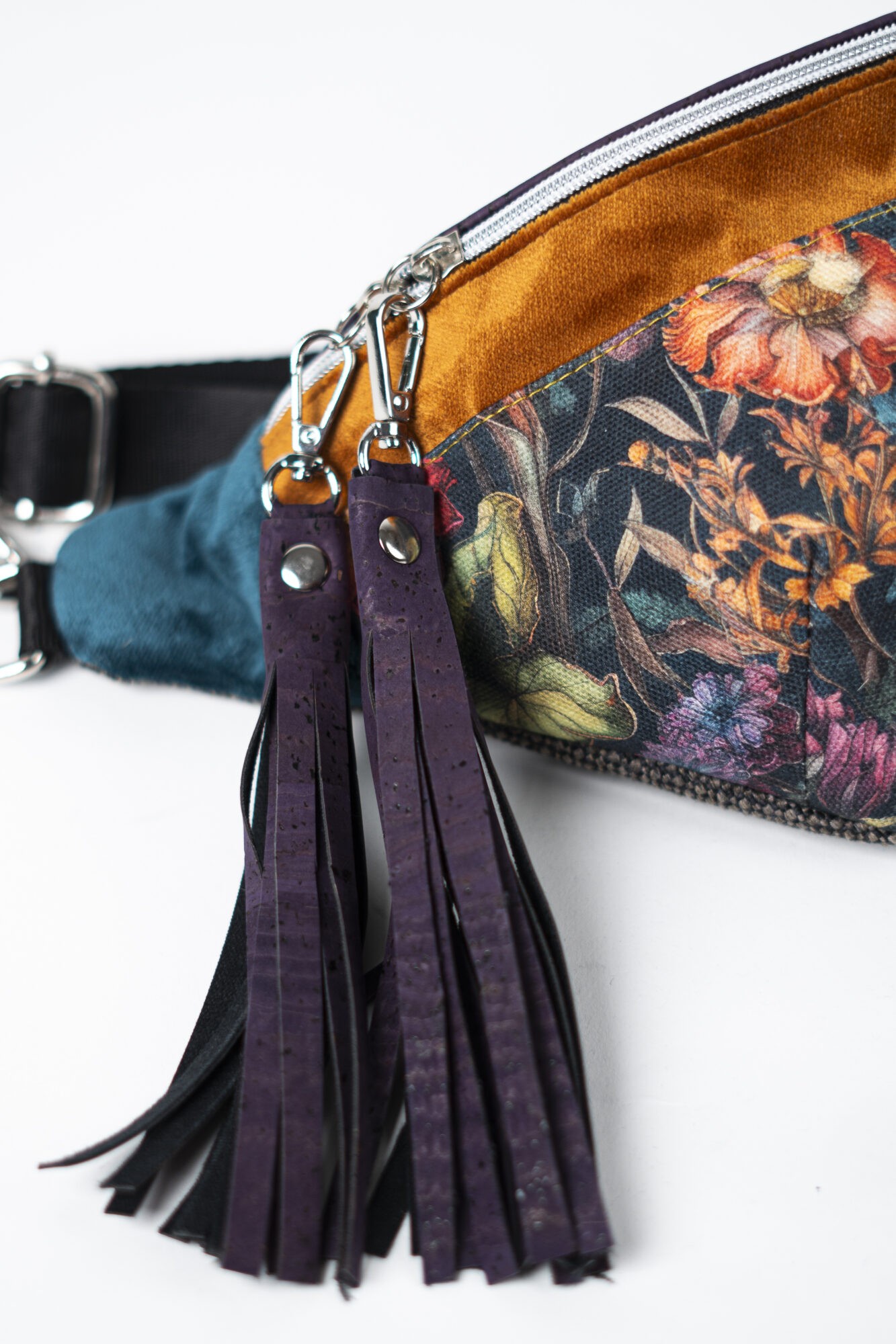 Nerka wyróżnia się zachwycającym kwiatowym wzorem, który przyciąga wzrok i dodaje energii każdej stylizacji. Wykonana z wysokiej jakości materiałów, nerka jest zarówno trwała, jak i elegancka. Klapka, stworzona z tkaniny korkowej w intensywnym kolorze fioletu, nadaje jej wyjątkowego charakteru, a dodatkowe ozdobne frędzle przy zamku dodają całości szyku i oryginalności.