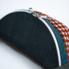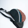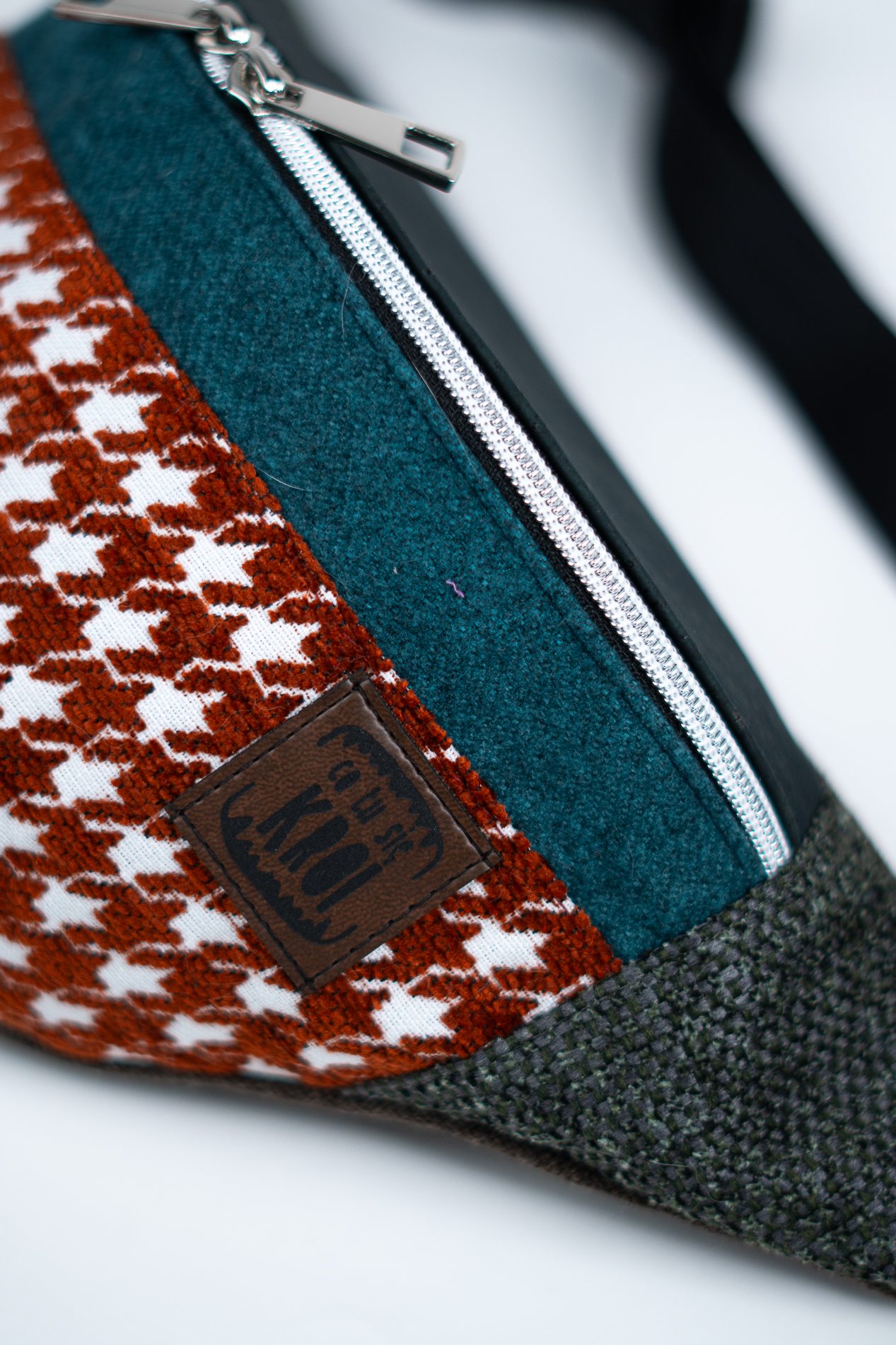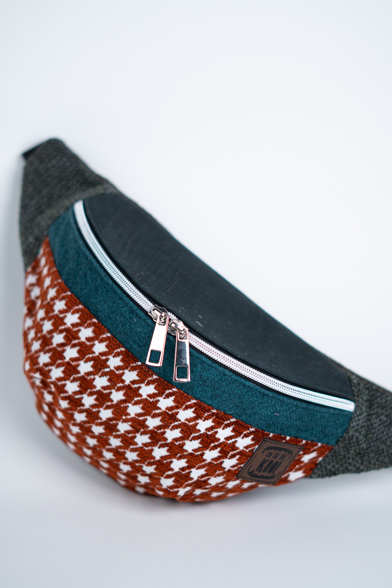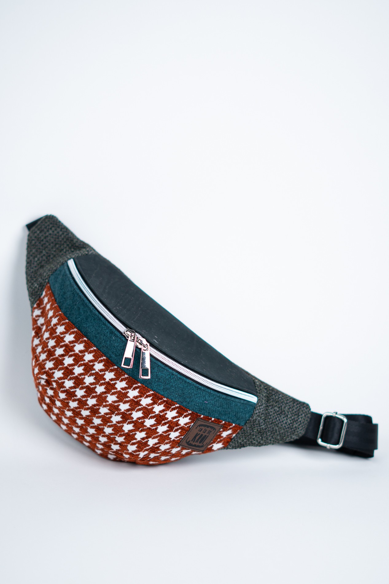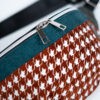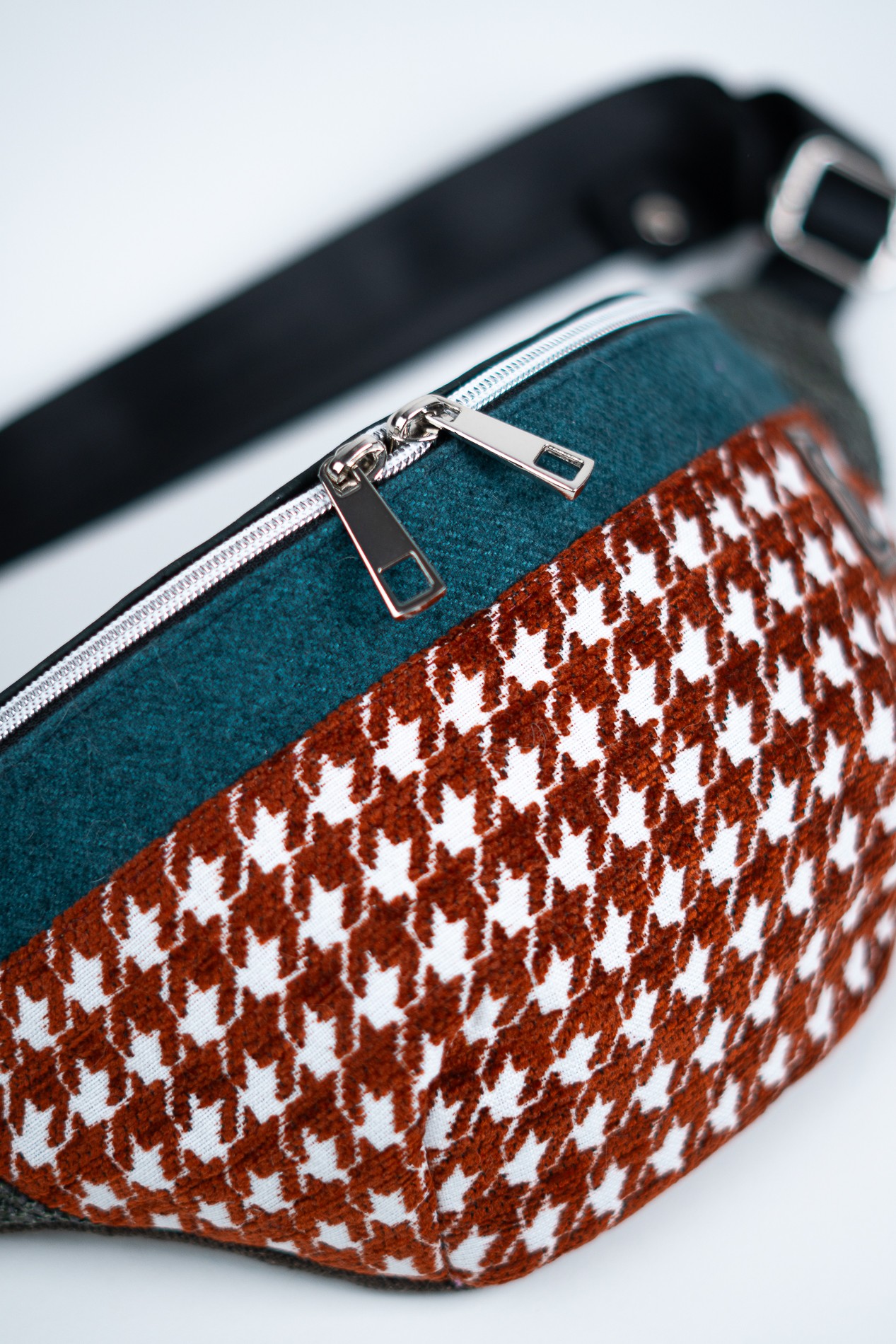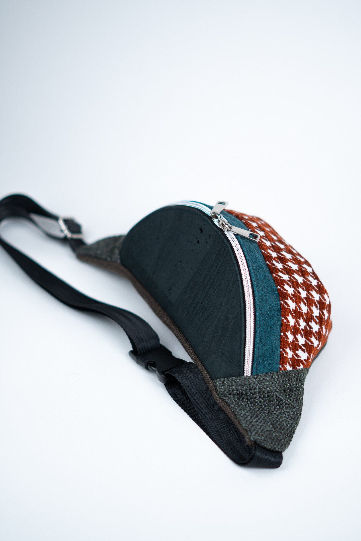 Front torby wykonano z miękkiej tkaniny w biało-ceglastą pepitkę, nadającej całości elegancji z lekkim retro sznytem. Klapka z czarnego korka nie tylko świetnie wygląda, ale też zwiększa odporność na wilgoć i zarysowania. Nerka posiada wewnętrzną kieszonkę zapinaną na suwak – idealną na telefon, dokumenty czy klucze. Główna komora zamykana jest na solidny podwójny zamek błyskawiczny w kolorze srebrnym.