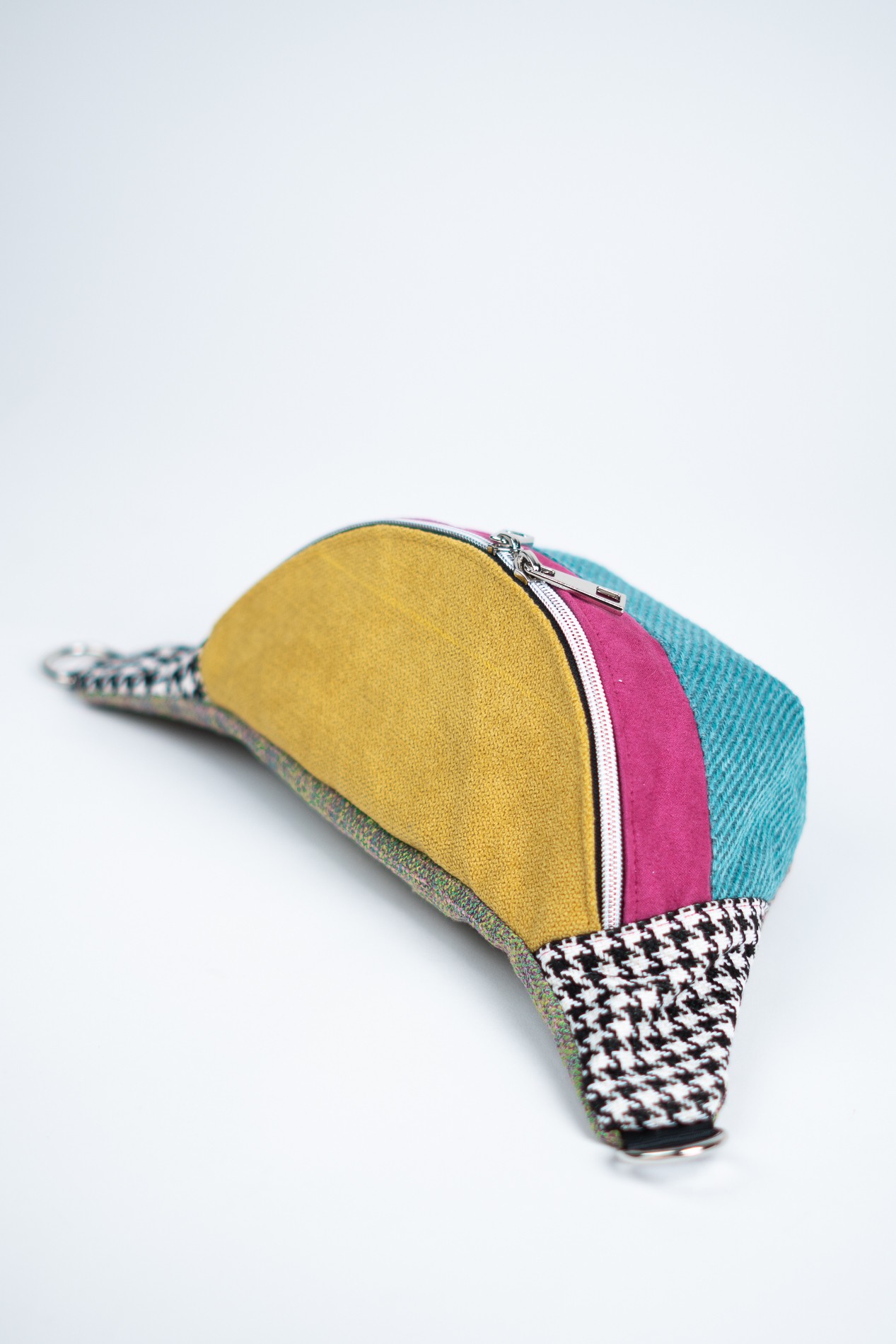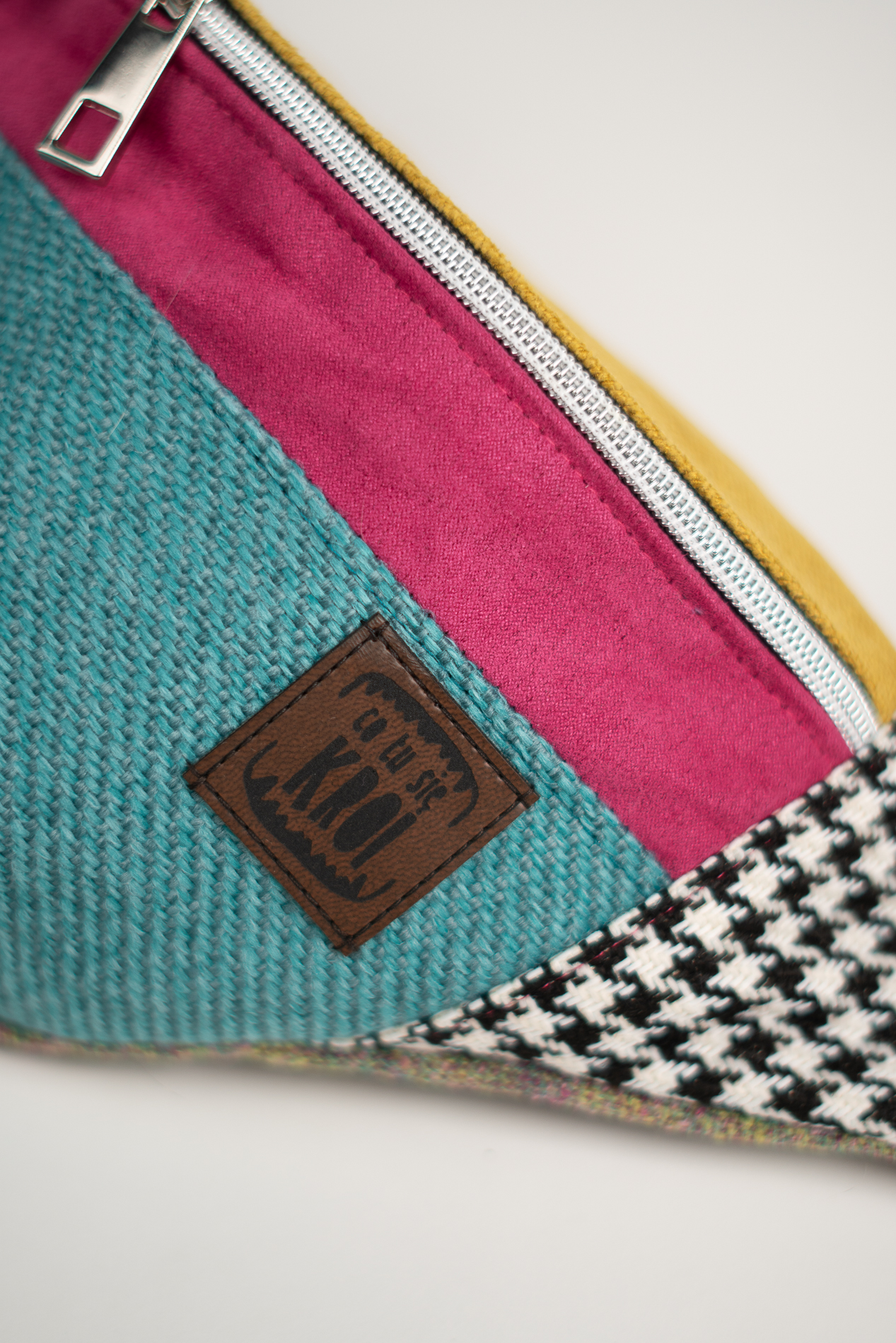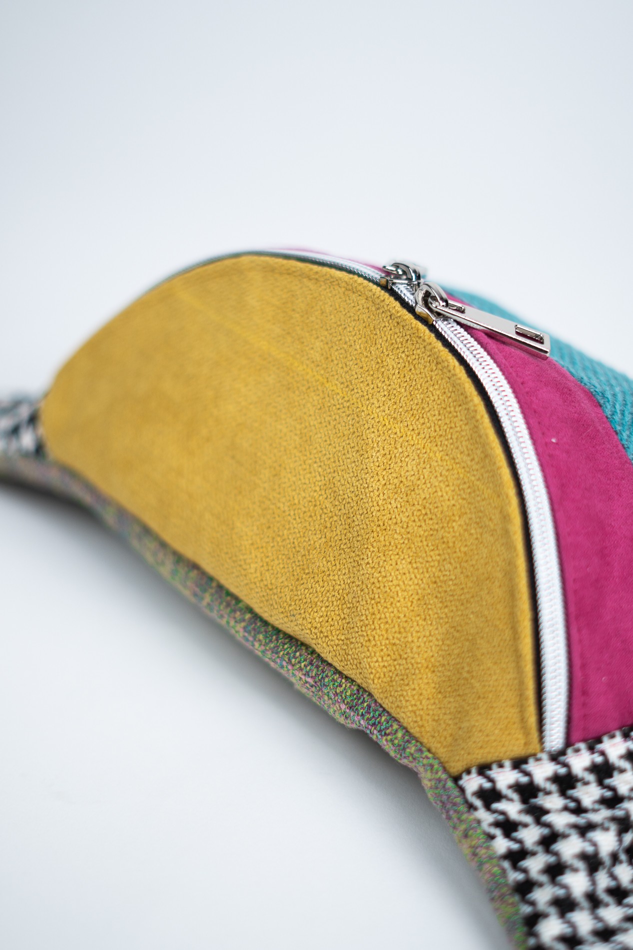 Energia kolorów, odrobina retro i maksimum wygody – ta nerka to idealny dodatek na lato. Wyróżnia się nie tylko praktyczną formą, ale przede wszystkim wyrazistą kolorystyką, która przyciąga wzrok i buduje nastrój każdej stylizacji. Musztardowa klapka spotyka się tu z intensywnym różem i głębokim, turkusowym dołem o wyraźnej strukturze tkaniny. Całość dopełniają boczne panele w klasyczną biało-czarną pepitkę, które nadają jej nutę stylu vintage i charakteru.