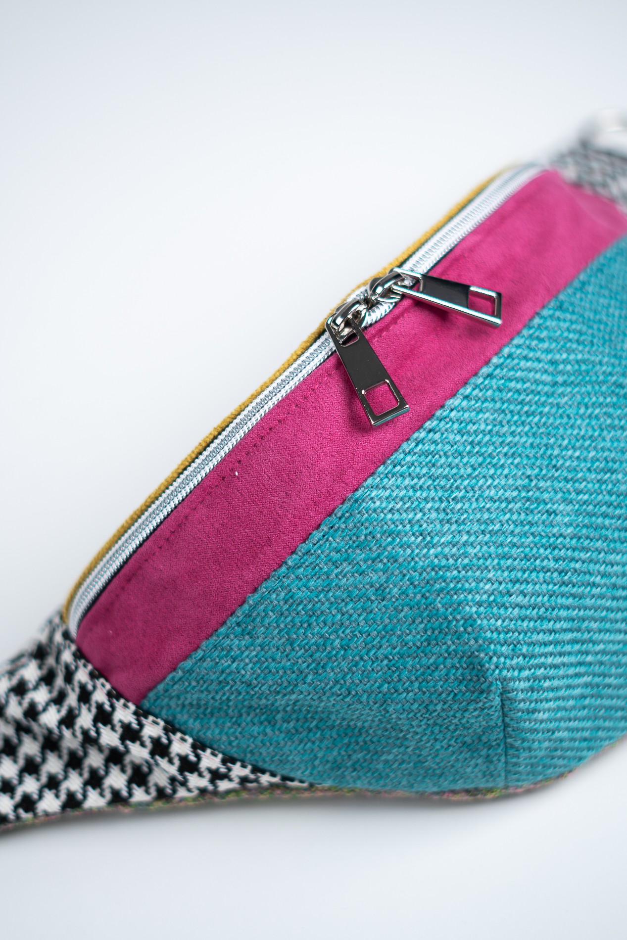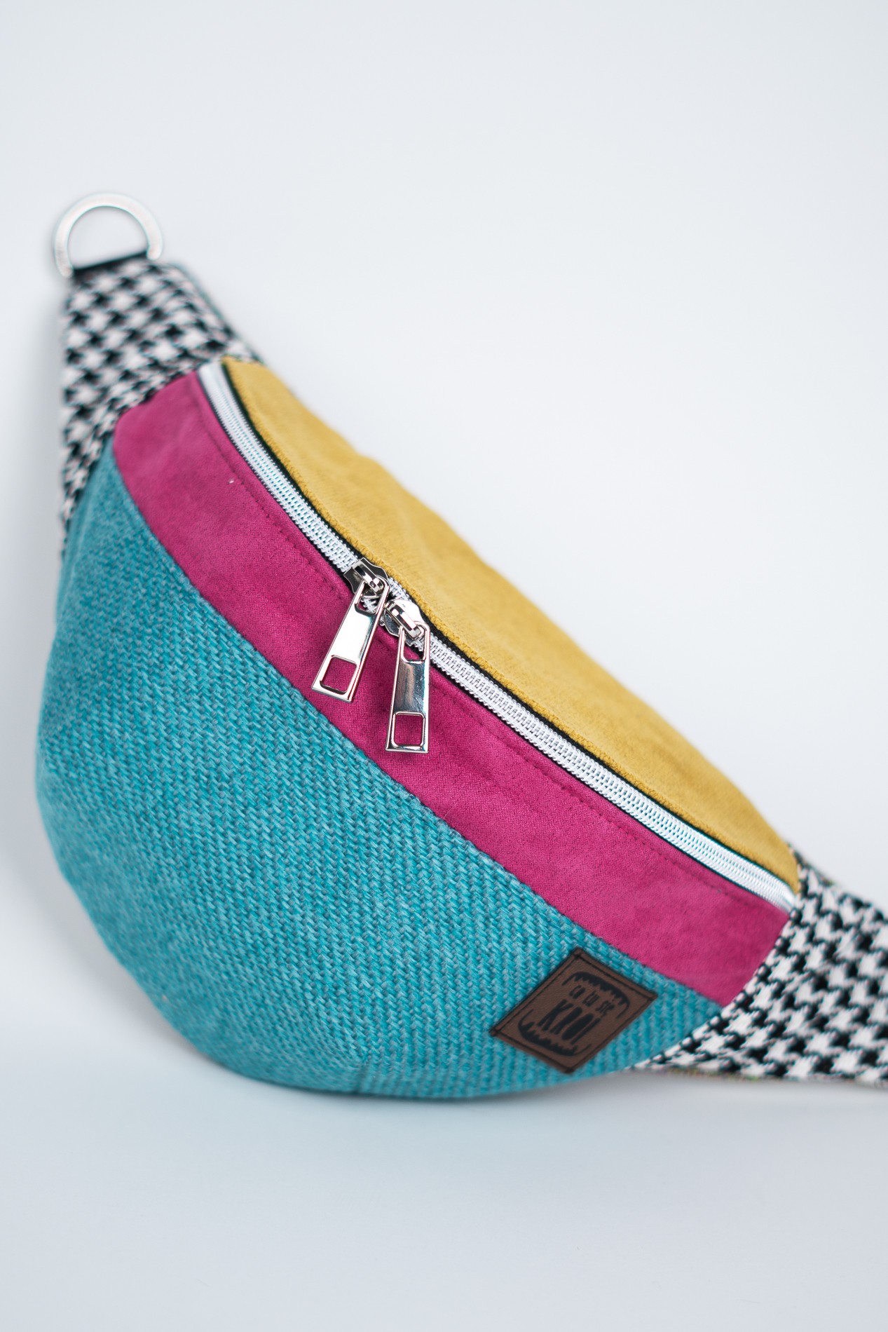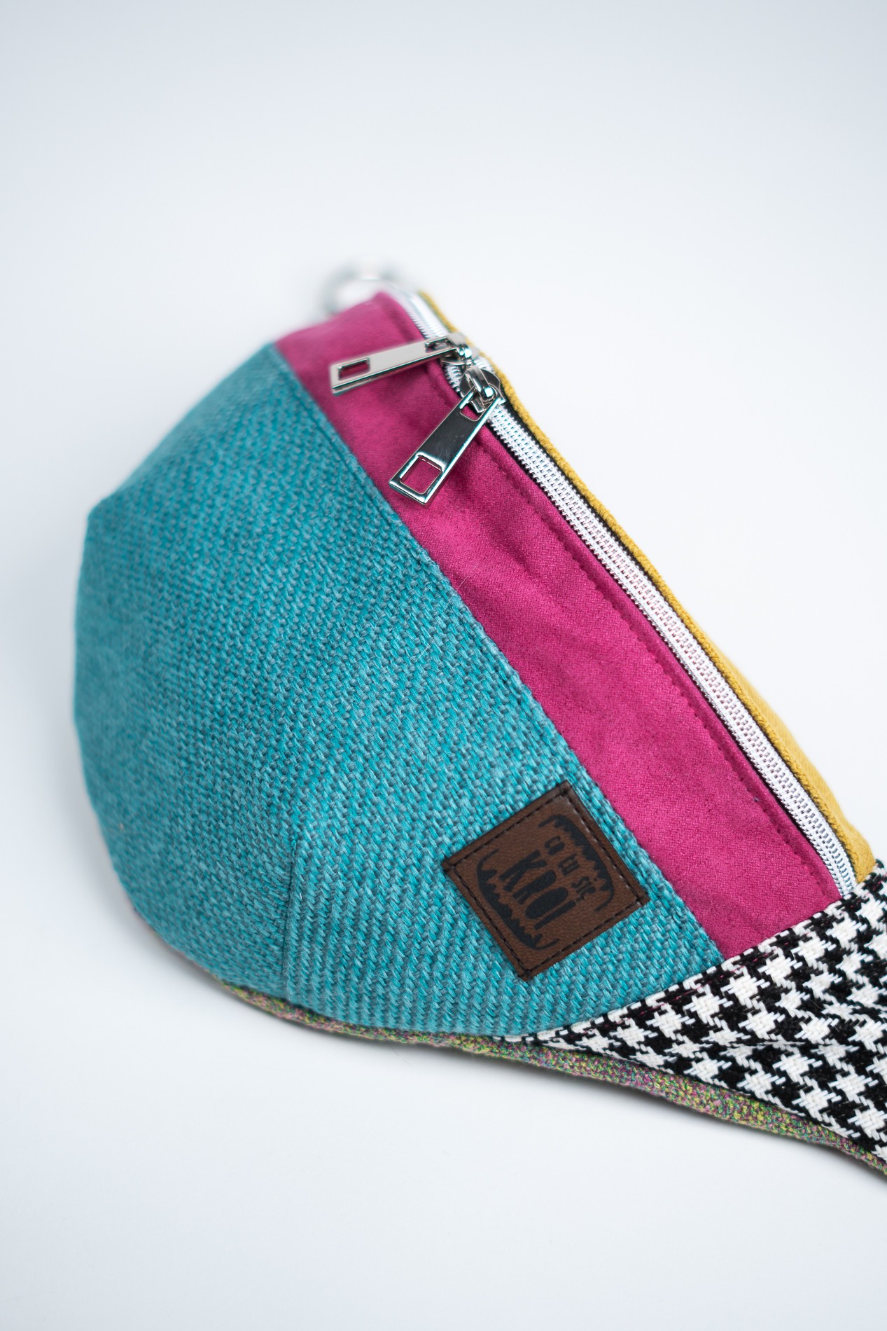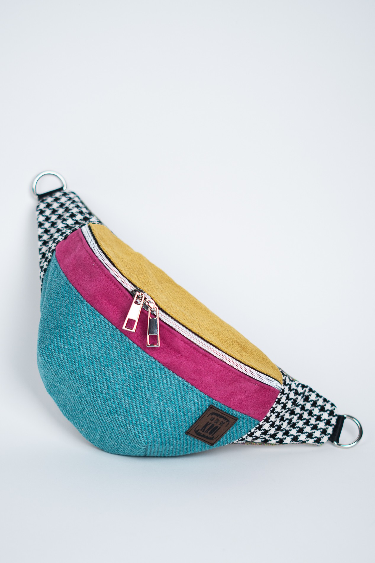 Energia kolorów, odrobina retro i maksimum wygody – ta nerka to idealny dodatek na lato. Wyróżnia się nie tylko praktyczną formą, ale przede wszystkim wyrazistą kolorystyką, która przyciąga wzrok i buduje nastrój każdej stylizacji. Musztardowa klapka spotyka się tu z intensywnym różem i głębokim, turkusowym dołem o wyraźnej strukturze tkaniny. Całość dopełniają boczne panele w klasyczną biało-czarną pepitkę, które nadają jej nutę stylu vintage i charakteru.