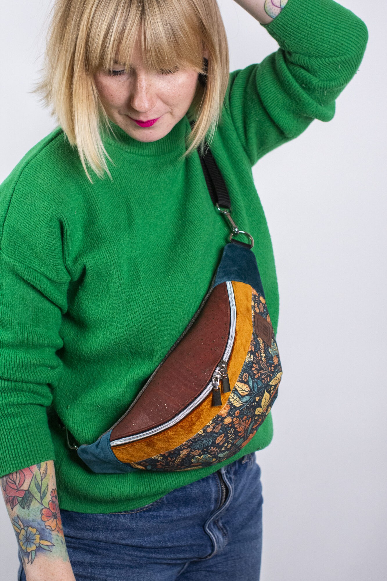 MATERIAŁ: tkanina tapicerska, tanina korkowa, podszewka, czarny pas samochodowy 25 mm.