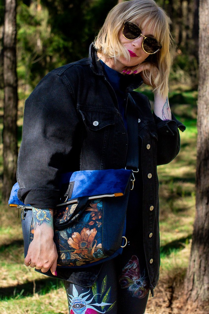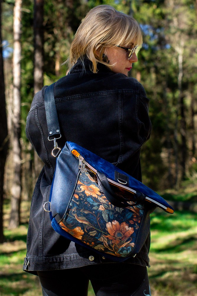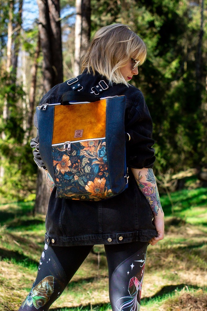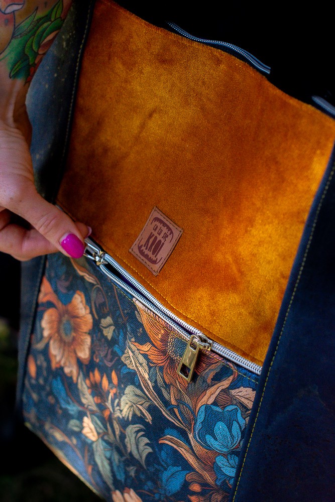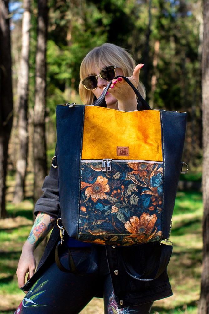 Odkryj nasz wyjątkowy torbo-plecak „Kwiatowy Obraz” – idealny towarzysz na miejskie wyprawy oraz do pracy! Ten stylowy plecak łączy w sobie elegancję i funkcjonalność, co czyni go doskonałym wyborem dla nowoczesnej kobiety. Wykonany z wysokiej jakości materiałów, z granatowym korkiem na bokach i dodatkiem musztardowego weluru na przodzie, przyciąga wzrok pięknym wzorem kwiatowym, który dodaje mu oryginalności.
