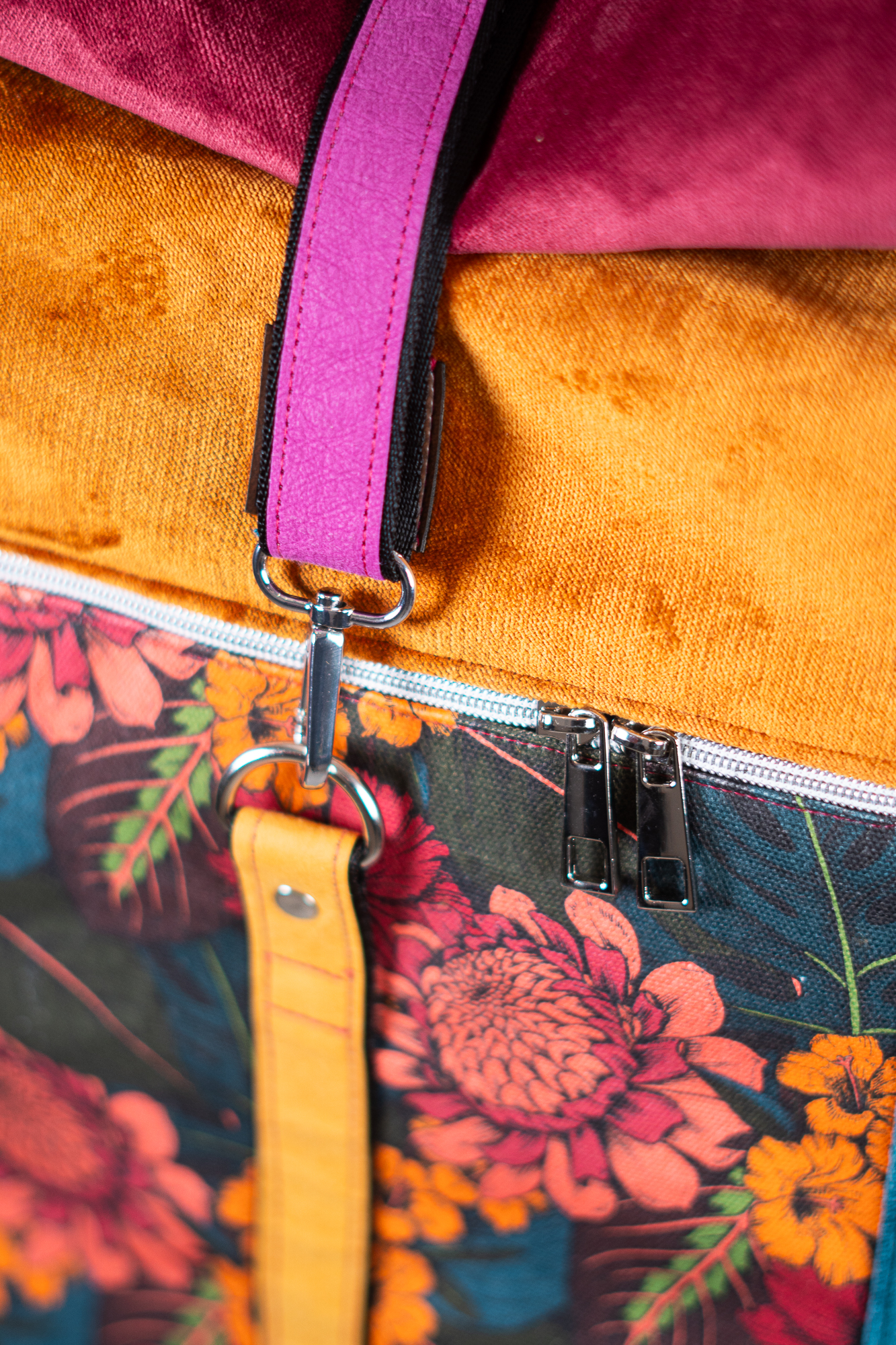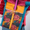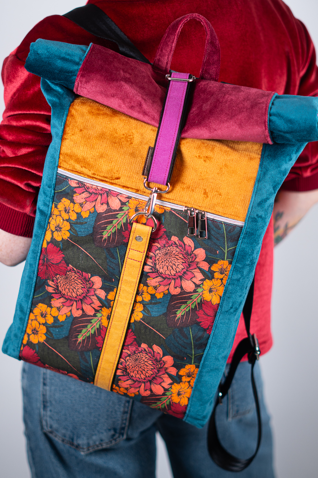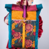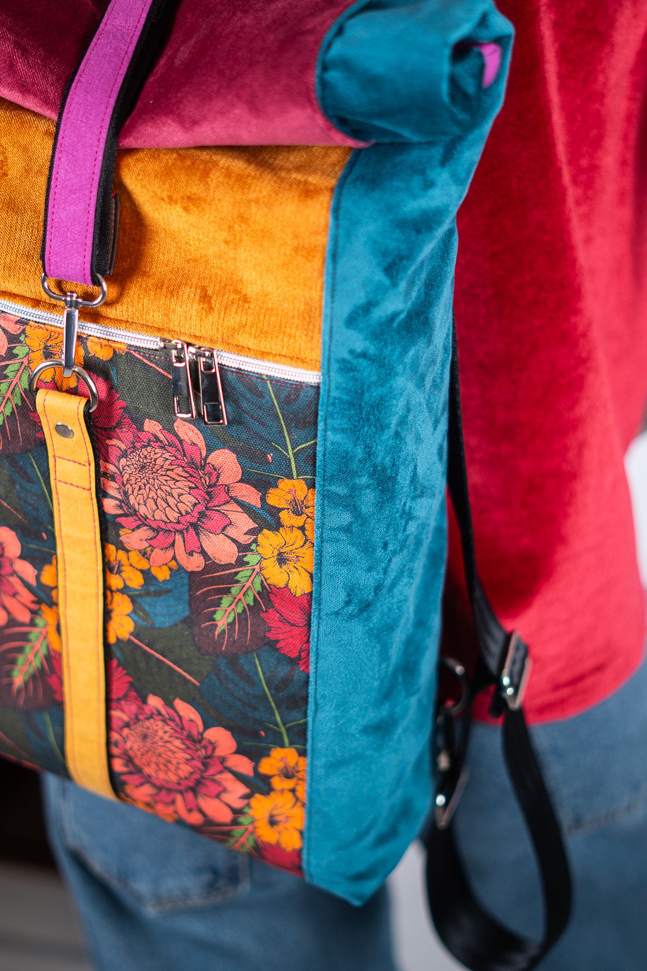 Sercem plecaka jest dolny panel z wyrazistym motywem botanicznym. Egzotyczne kwiaty w odcieniach koralu i słonecznej żółci kontrastują z głęboką zielenią liści, tworząc kompozycję pełną życia. Całość została oprawiona w luksusowe, aksamitne tkaniny w kolorach nasyconego morskiego turkusu, musztardy i burgundu. Takie zestawienie sprawia, że plecak zmienia charakter w zależności od światła, dodając Twojej stylizacji głębi.