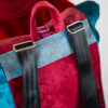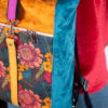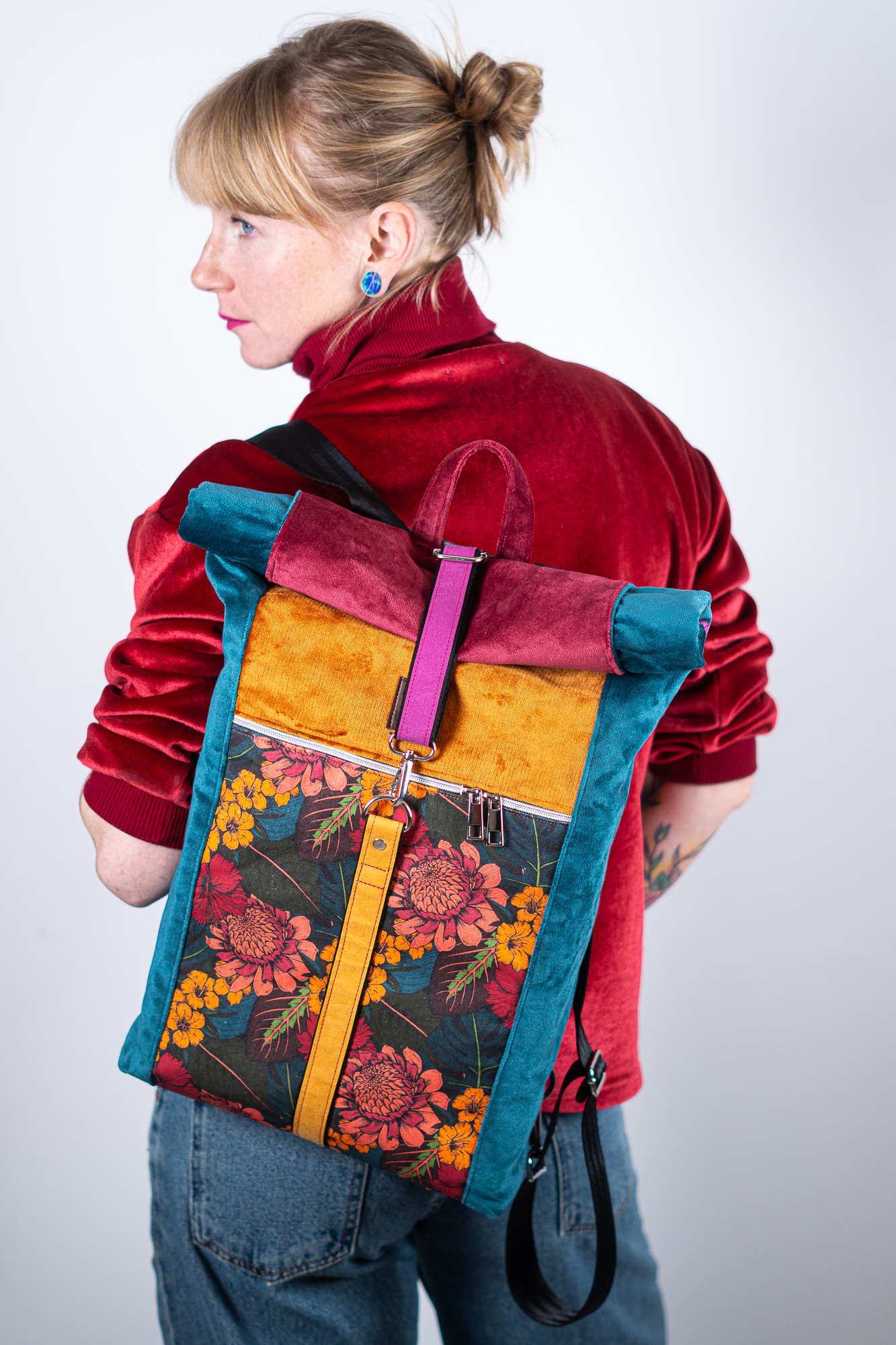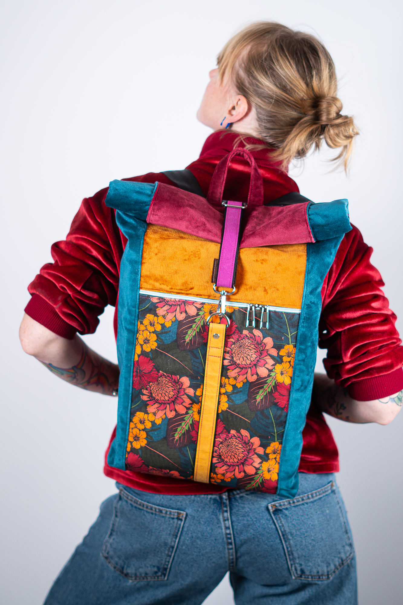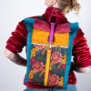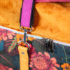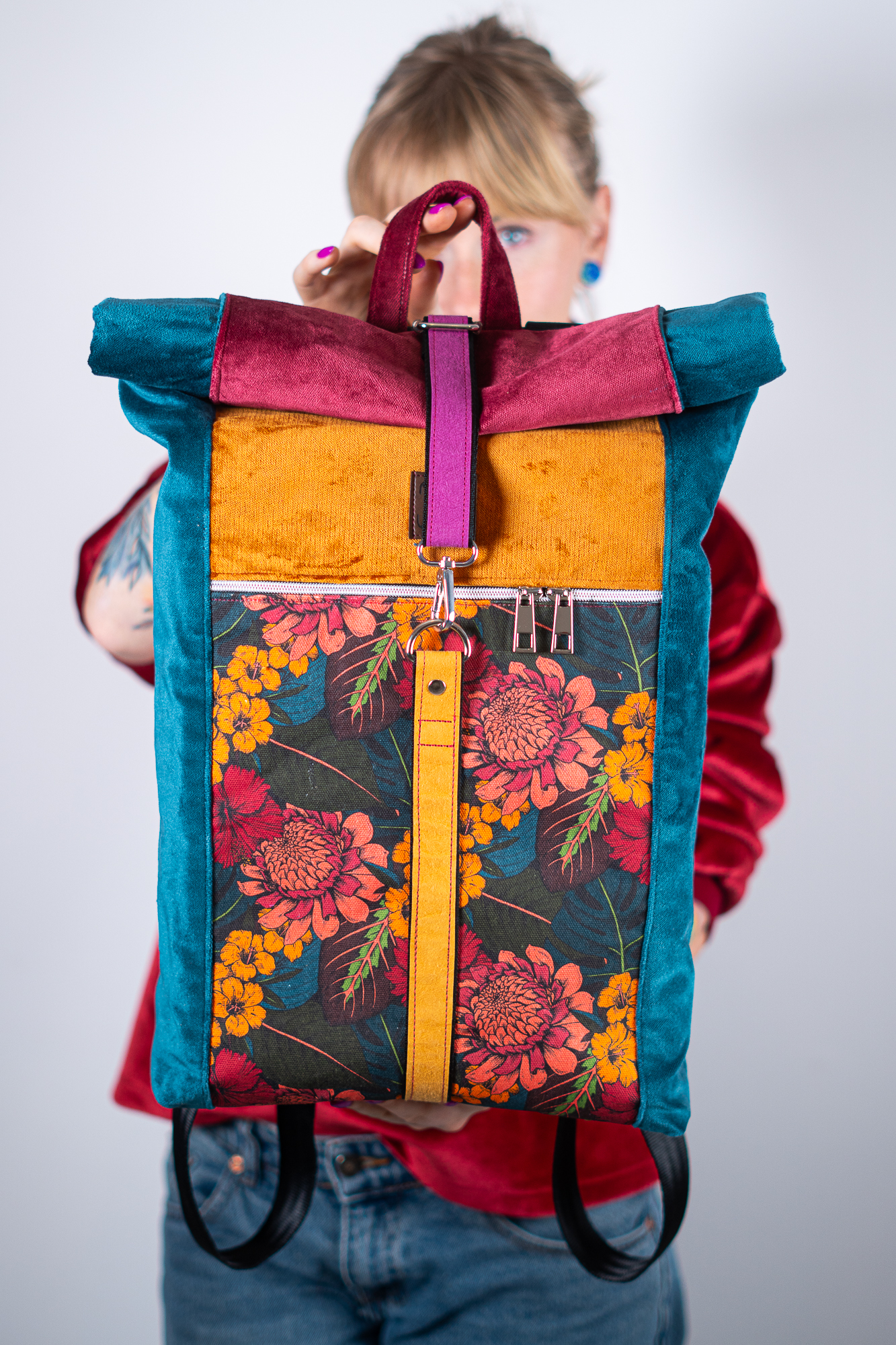 Sercem plecaka jest dolny panel z wyrazistym motywem botanicznym. Egzotyczne kwiaty w odcieniach koralu i słonecznej żółci kontrastują z głęboką zielenią liści, tworząc kompozycję pełną życia. Całość została oprawiona w luksusowe, aksamitne tkaniny w kolorach nasyconego morskiego turkusu, musztardy i burgundu. Takie zestawienie sprawia, że plecak zmienia charakter w zależności od światła, dodając Twojej stylizacji głębi.