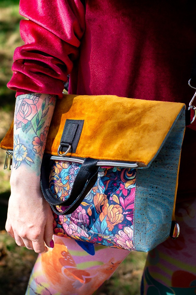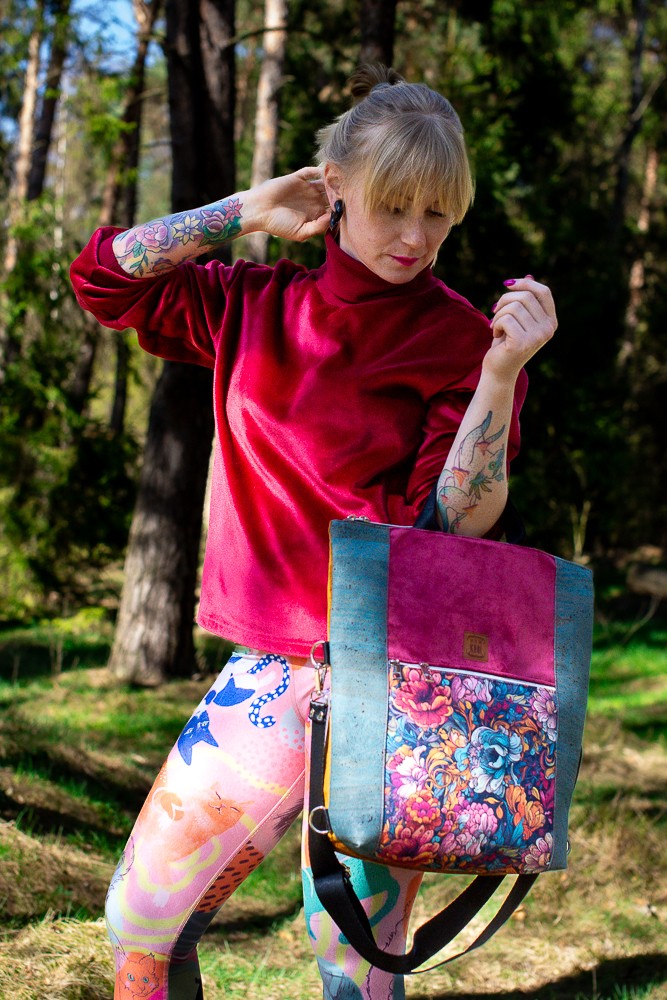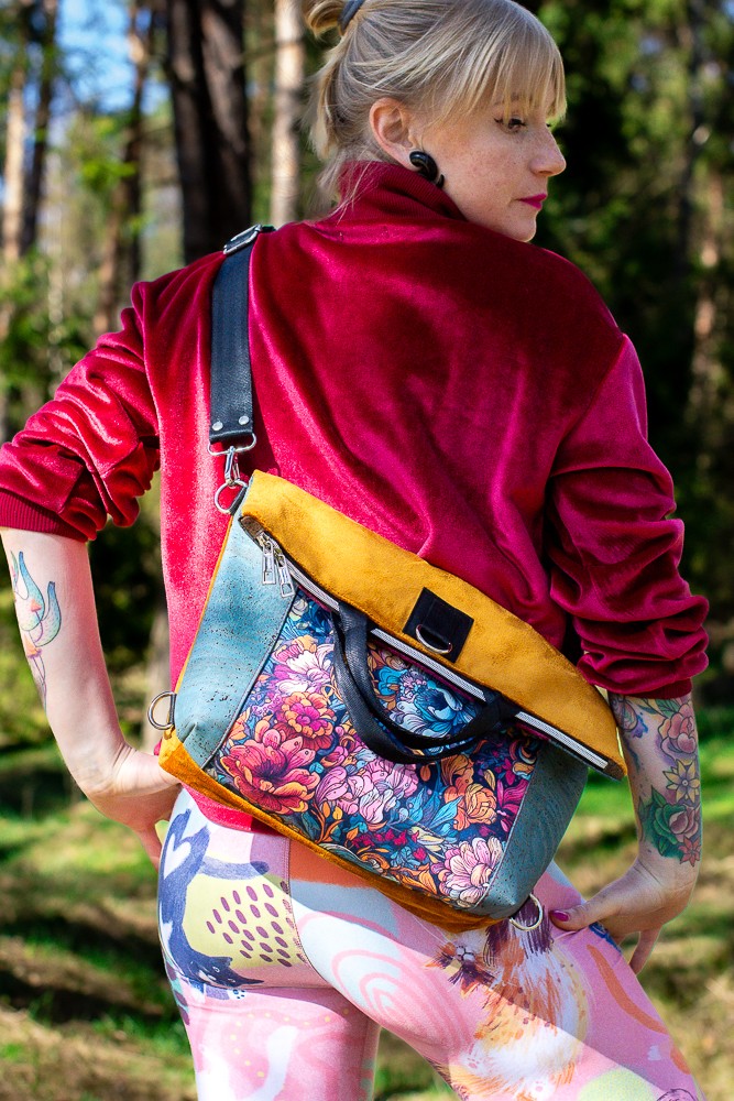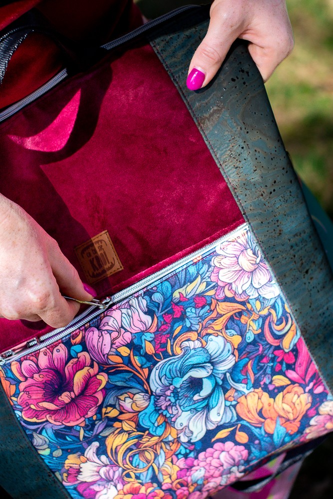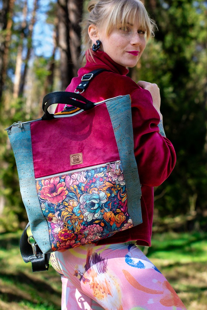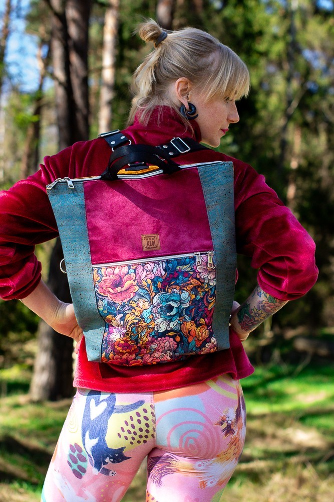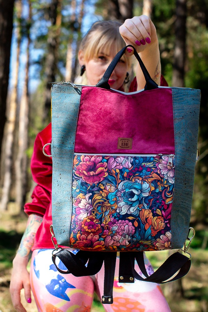 Zanurz się w kwiatowej feerii barw z plecako-torebką z kolekcji RÓŻANA AURA. To niezwykle funkcjonalny model 2w1 – torebka i plecak w jednym – który zaskakuje zarówno intensywnością kolorów, jak i praktycznymi rozwiązaniami. Zachwyca wyrazistym, bajecznie kolorowym wzorem kwiatów na froncie, głębokim bordo na głównej części i wyjątkowymi bokami wykonanymi z turkusowego korka – ekologicznego, trwałego i efektownego materiału.