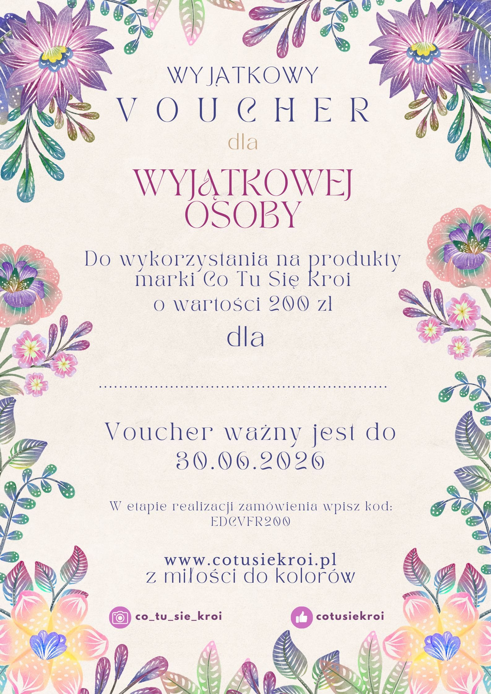 VOUCHER 200 zł od Co Tu Się Kroi – prezent idealny! Podaruj bliskiej osobie kolorowy świat ręcznie tworzonych akcesoriów. Voucher do samodzielnego wydruku, dostępny od razu po zakupie — szybki, piękny i zawsze trafiony prezent!