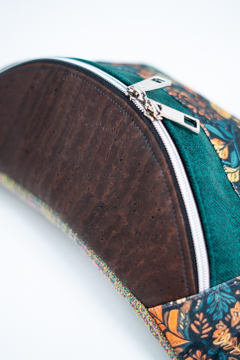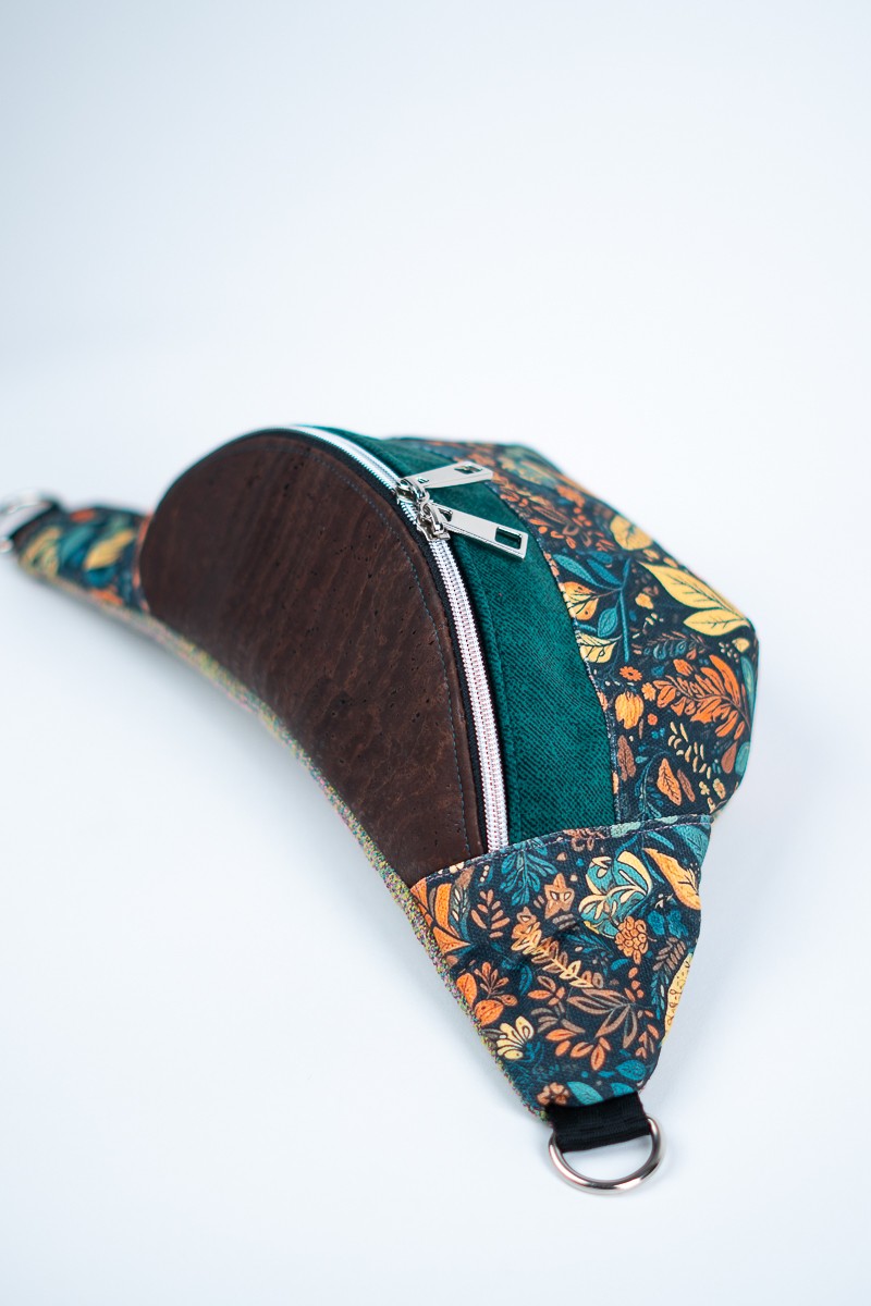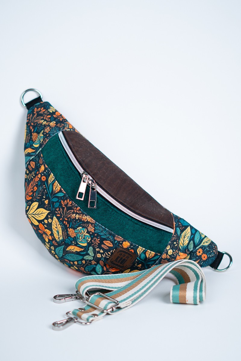 MATERIAŁ: tkanina korkowa, drukowana gabardyna, tkanina tapicerska, podszewska z kieszonką na suwak, ozdobny pas nośny 38 mm.