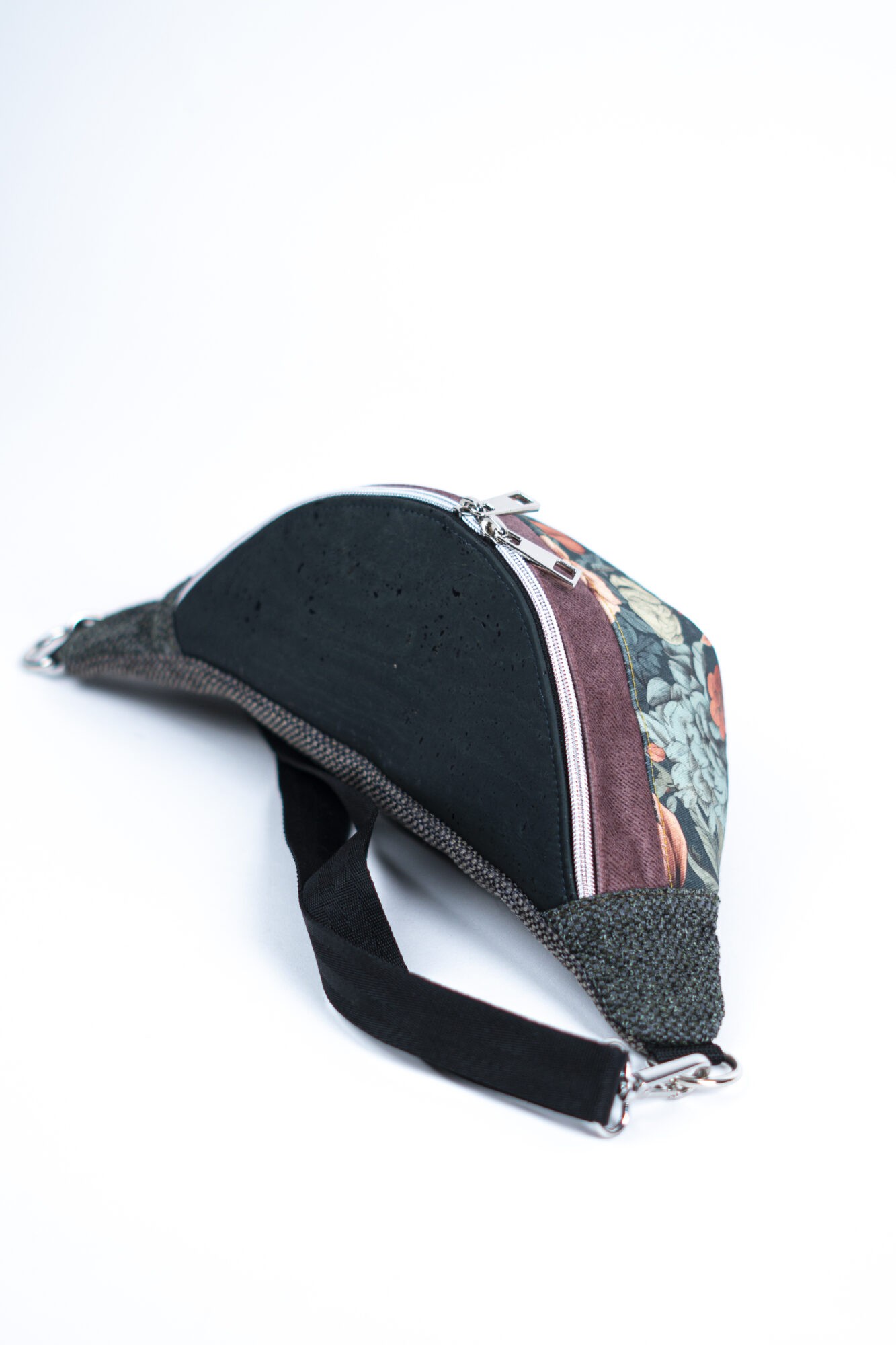 MATERIAŁ: kolorowa tkanina korkowa, drukowana gabardyna bawełniana 272 g/m2, tkanina tapicerska, wersja z bawełnianą podszewką 125 g/m2, pas samochodowy czarny 25 mm.