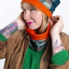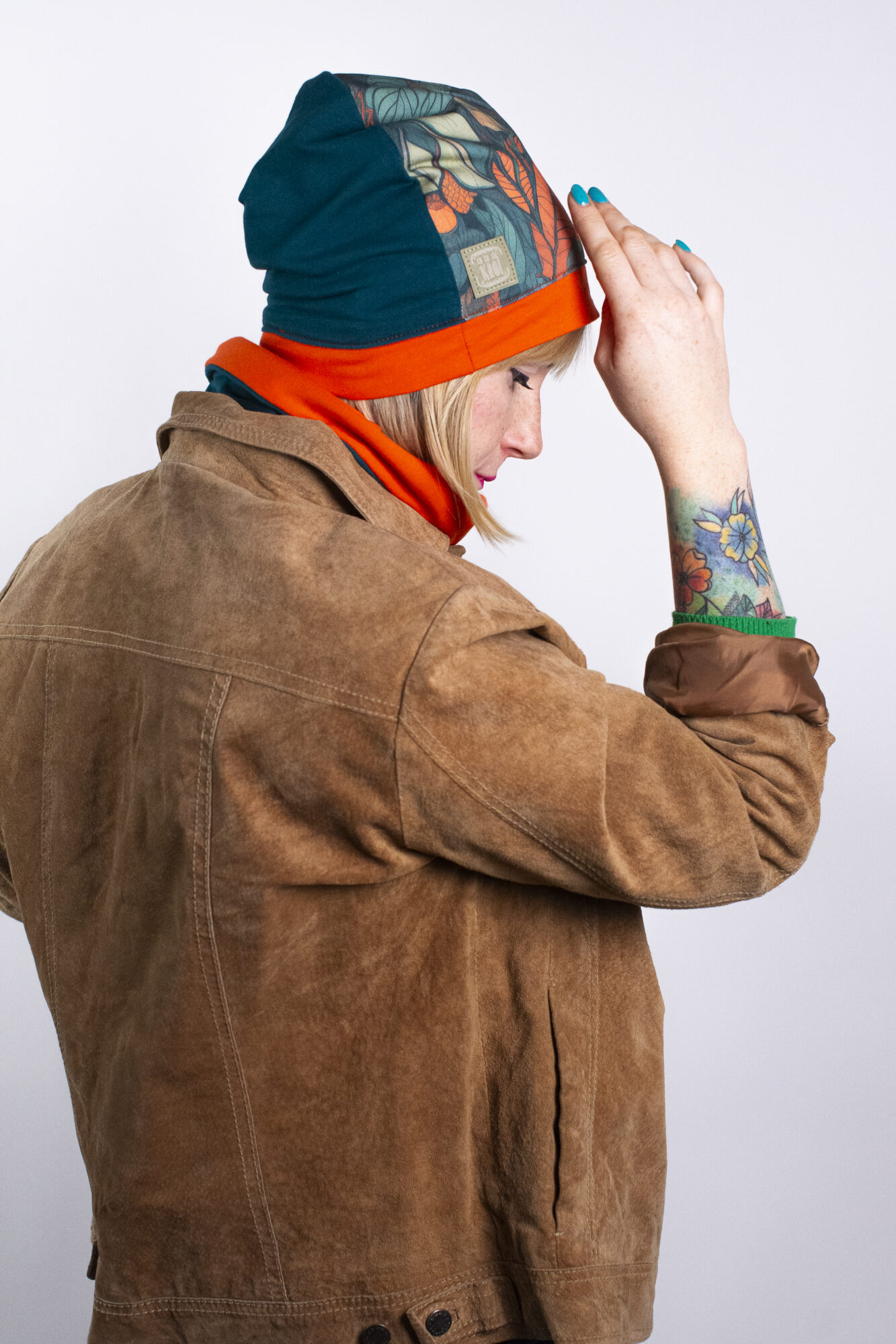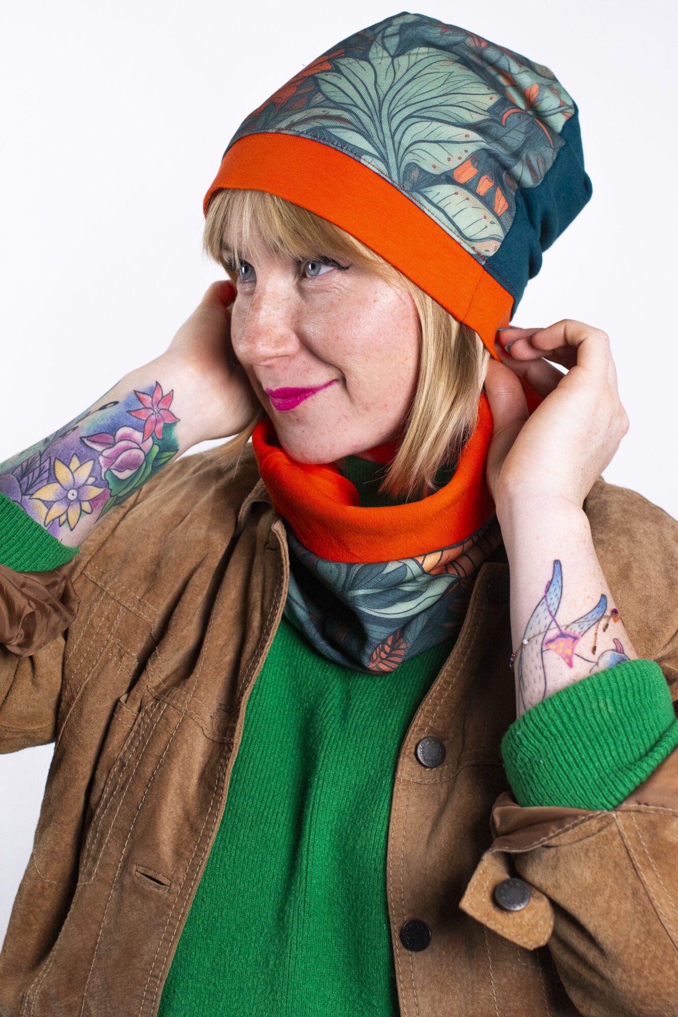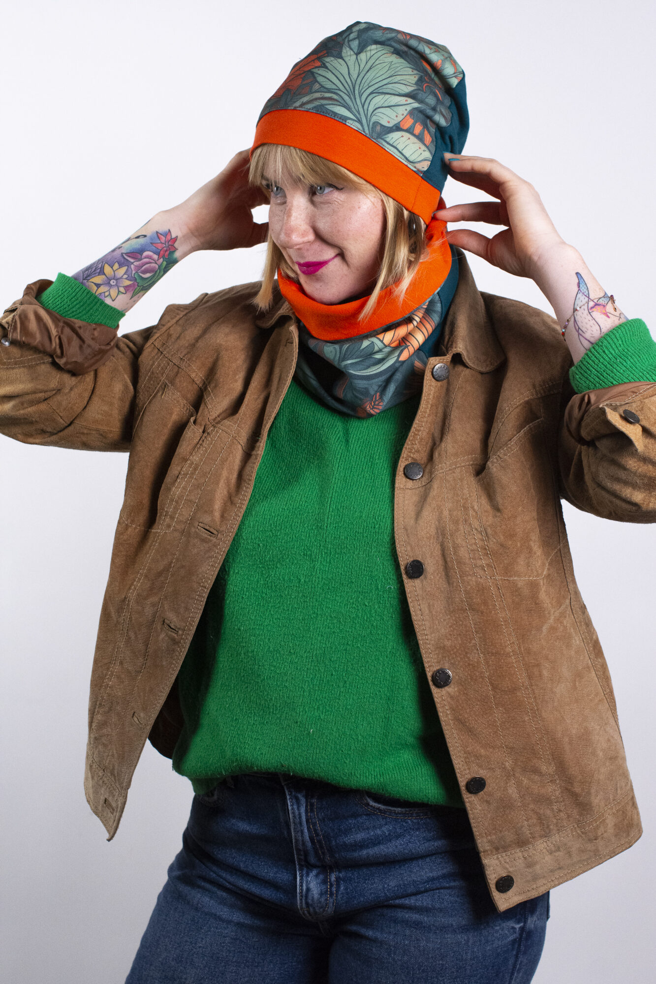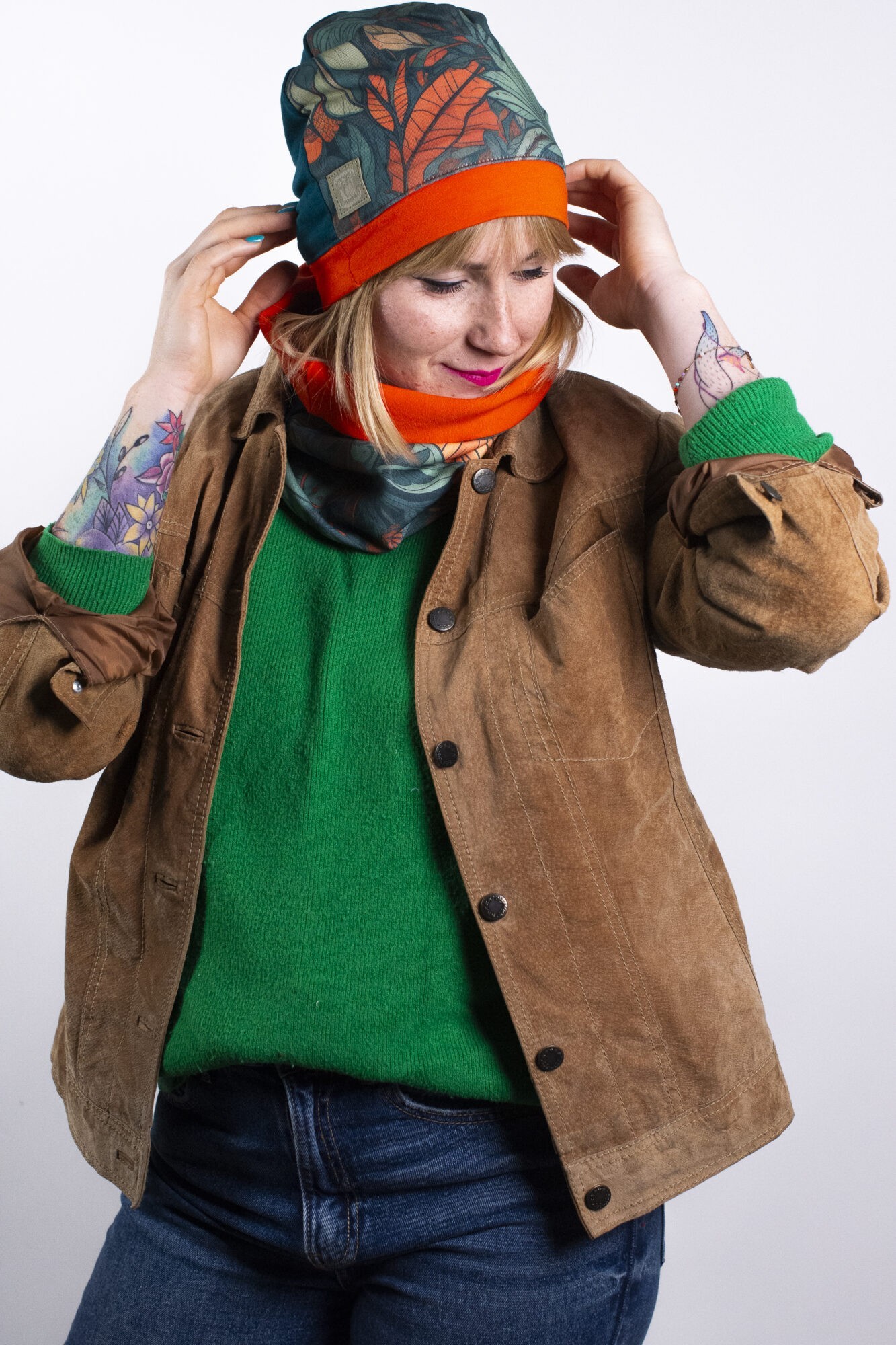 Przedstawiamy Państwu wyjątkowy zielono-pomarańczowy komplet damski z kolekcji ZIELONA OAZA, który łączy w sobie elegancję i komfort. W skład kompletu wchodzi stylowa czapka w kwiaty damska oraz praktyczny komin, oba ozdobione subtelnym, pastelowym wzorem liści, który przyciąga wzrok i podkreśla wiosenny charakter całej stylizacji.