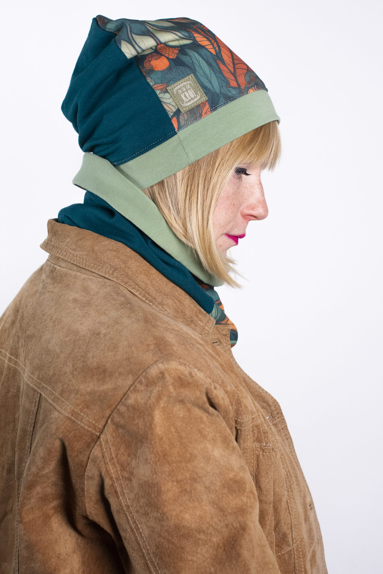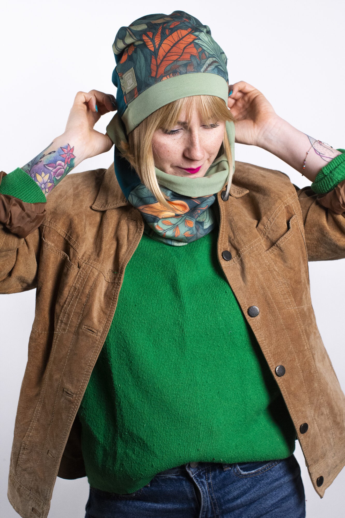 Komplet doskonale komponuje się z innymi elementami garderoby, a jego uniwersalny charakter sprawia, że możesz go nosić na różne okazje – od spacerów po parku, po spotkania z przyjaciółmi. Ciepły komin w zielone liście dopełnia całość, zapewniając komfort i ochronę przed chłodem.