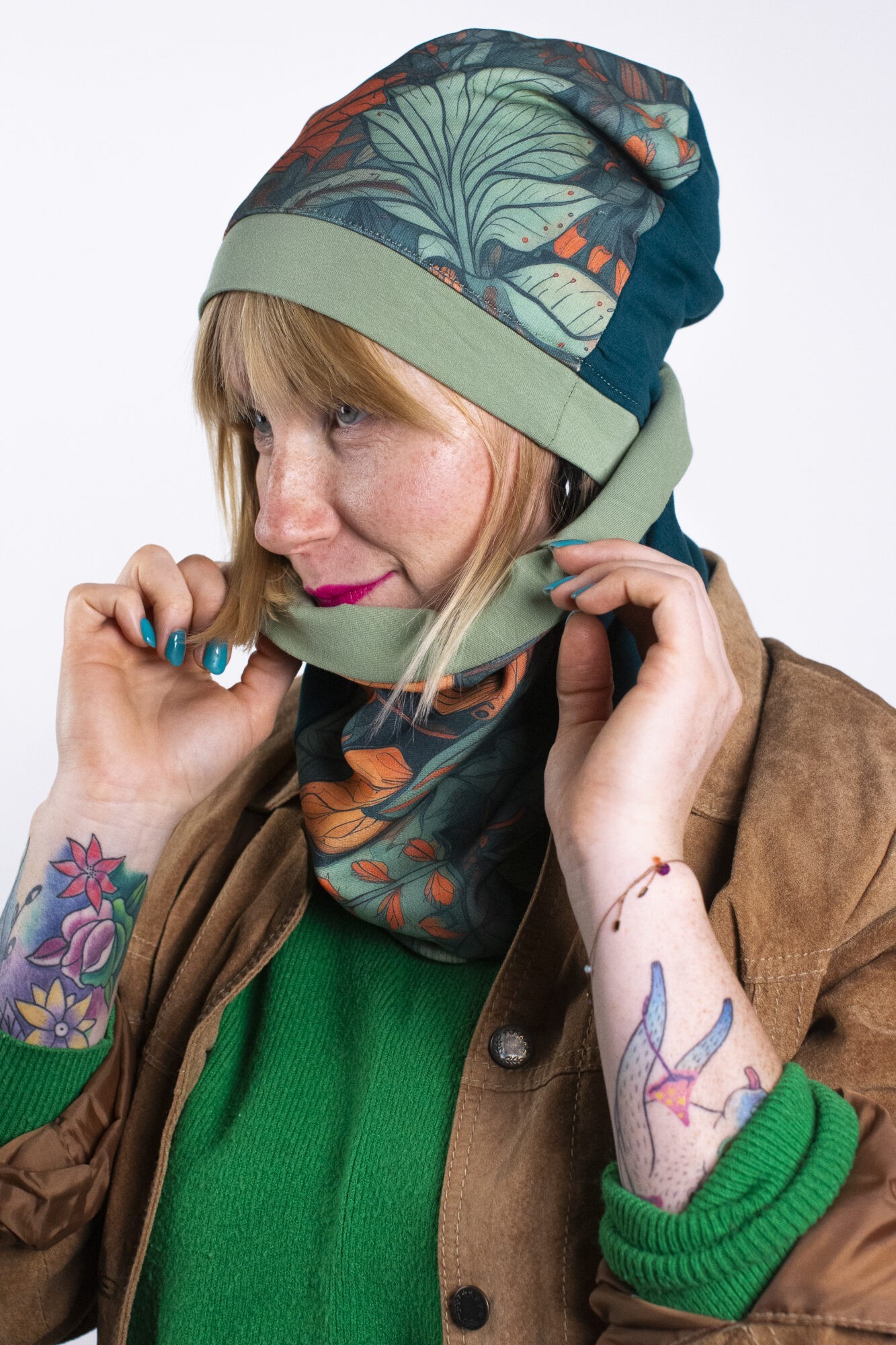 Odkryj magię wiosny z kolekcją ZIELONA OAZA, która przenosi nas w świat pełen świeżości i naturalnego piękna. Nasz pastelowy zielony komplet damski, składający się z czapki w kwiaty oraz stylowego komina w zielone liście, to idealny wybór dla kobiet, które pragną łączyć modę z wygodą.
